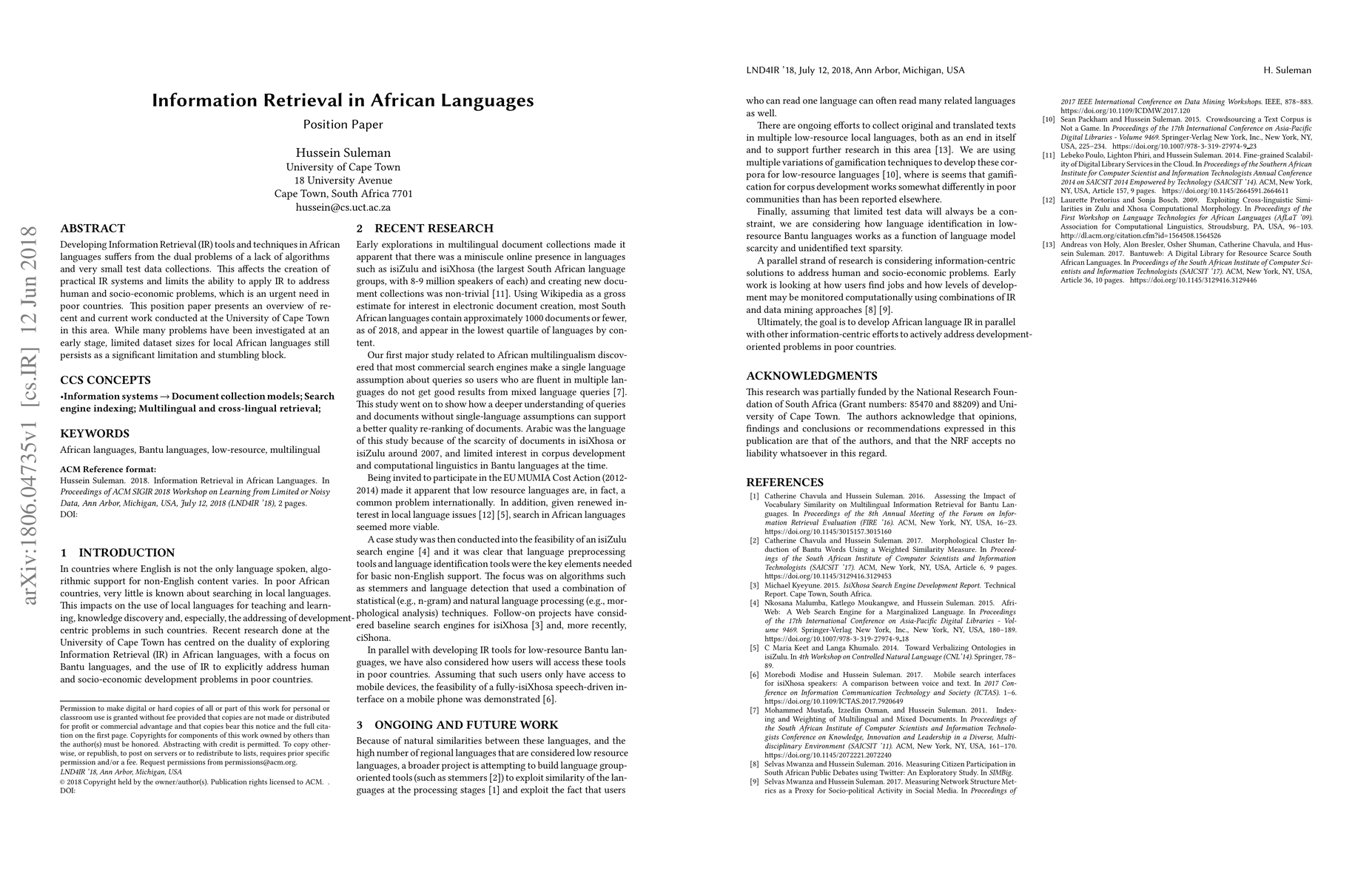 Developing Information Retrieval (IR) tools and techniques in African languages suffers from the dual problems of a lack of algorithms and very small test data collections. This affects the creation of practical IR systems and limits the ability to apply IR to address human and socio-economic problems, which is an urgent need in poor countries. This position paper presents an overview of recent and current work conducted at the University of Cape Town in this area. While many problems have been investigated at an early stage, limited dataset sizes for local African languages still persists as a significant limitation and stumbling block.