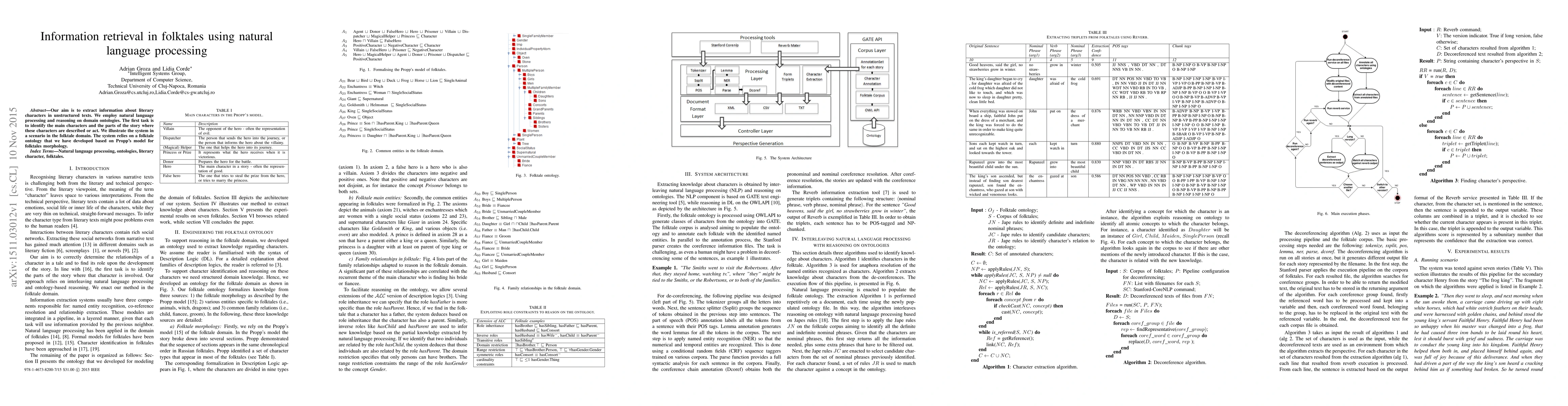 This research develops a natural language processing system to extract information about literary characters in folktales by identifying main characters and their roles using a custom folktale ontology based on Propp's model. The system demonstrates its effectiveness in the folktale domain.