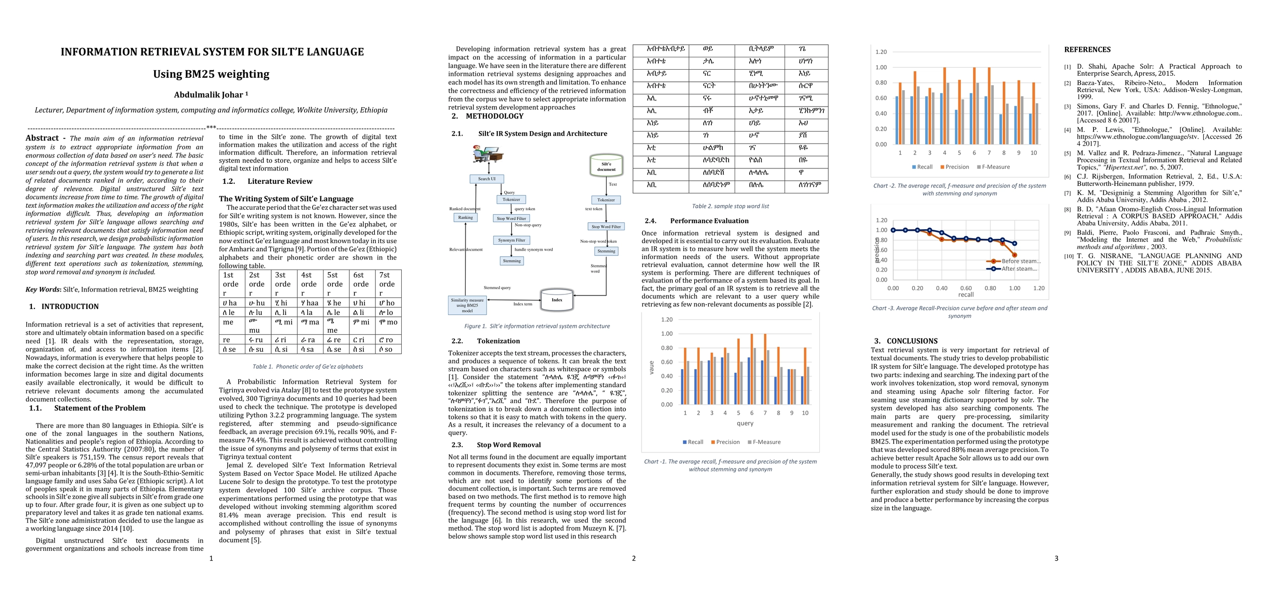 This research develops a probabilistic information retrieval system for the Silte language using the BM25 weighting method. The system includes indexing and searching components with text operations like tokenization, stemming, stop word removal, and synonym handling to facilitate the retrieval of relevant documents from growing digital text collections.