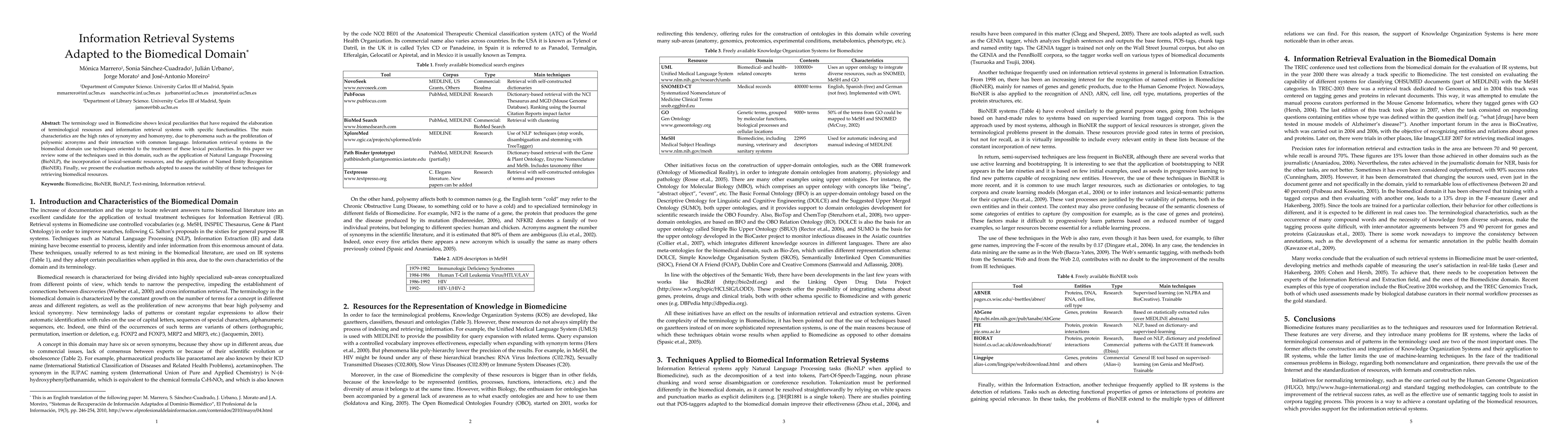 The terminology used in Biomedicine shows lexical peculiarities that have required the elaboration of terminological resources and information retrieval systems with specific functionalities. The main characteristics are the high rates of synonymy and homonymy, due to phenomena such as the proliferation of polysemic acronyms and their interaction with common language. Information retrieval systems in the biomedical domain use techniques oriented to the treatment of these lexical peculiarities. In this paper we review some of the techniques used in this domain, such as the application of Natural Language Processing (BioNLP), the incorporation of lexical-semantic resources, and the application of Named Entity Recognition (BioNER). Finally, we present the evaluation methods adopted to assess the suitability of these techniques for retrieving biomedical resources.
