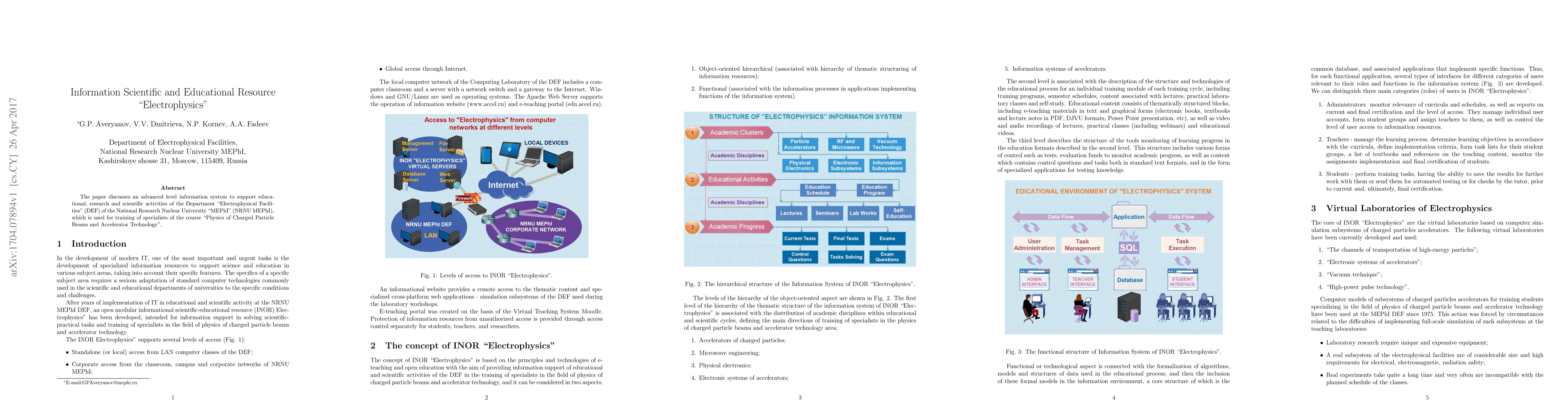 The paper discusses an advanced level information system to support educational, research and scientific activities of the Department "Electrophysical Facilities" (DEF) of the National Research Nuclear University "MEPhI" (NRNU MEPhI), which is used for training of specialists of the course "Physics of Charged Particle Beams and Accelerator Technology".
