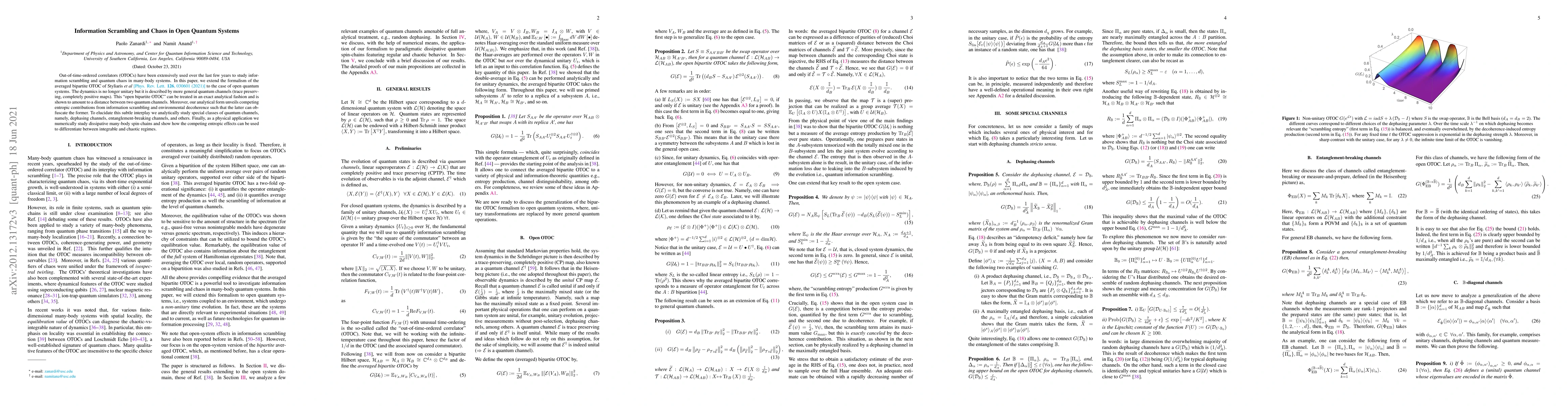 Out-of-time-ordered correlators (OTOCs) have been extensively used over the last few years to study information scrambling and quantum chaos in many-body systems. In this paper, we extend the formalism of the averaged bipartite OTOC of Styliaris et al [Phys. Rev. Lett. 126, 030601 (2021)] to the case of open quantum systems. The dynamics is no longer unitary but it is described by more general quantum channels (trace preserving, completely positive maps). This "open bipartite OTOC" can be treated in an exact analytical fashion and is shown to amount to a distance between two quantum channels. Moreover, our analytical form unveils competing entropic contributions from information scrambling and environmental decoherence such that the latter can obfuscate the former. To elucidate this subtle interplay we analytically study special classes of quantum channels, namely, dephasing channels, entanglement-breaking channels, and others. Finally, as a physical application we numerically study dissipative many-body spin-chains and show how the competing entropic effects can be used to differentiate between integrable and chaotic regimes.