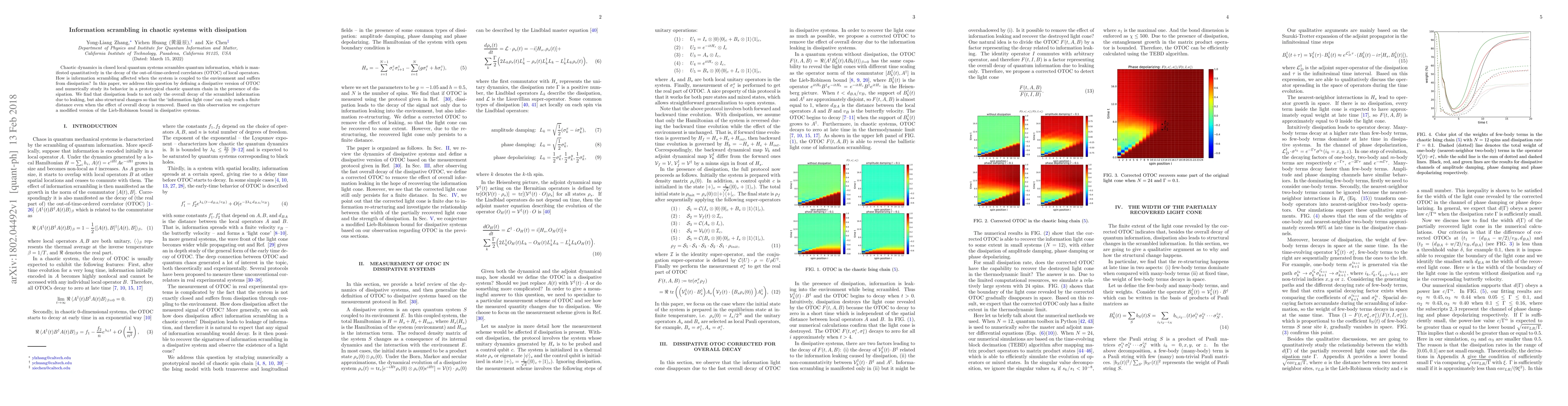 Chaotic dynamics in closed local quantum systems scrambles quantum information, which is manifested quantitatively in the decay of the out-of-time-ordered correlators (OTOC) of local operators. How is information scrambling affected when the system is coupled to the environment and suffers from dissipation? In this paper, we address this question by defining a dissipative version of OTOC and numerically study its behavior in a prototypical chaotic quantum chain in the presence of dissipation. We find that dissipation leads to not only the overall decay of the scrambled information due to leaking, but also structural changes so that the `information light cone' can only reach a finite distance even when the effect of overall decay is removed. Based on this observation we conjecture a modified version of the Lieb-Robinson bound in dissipative systems.