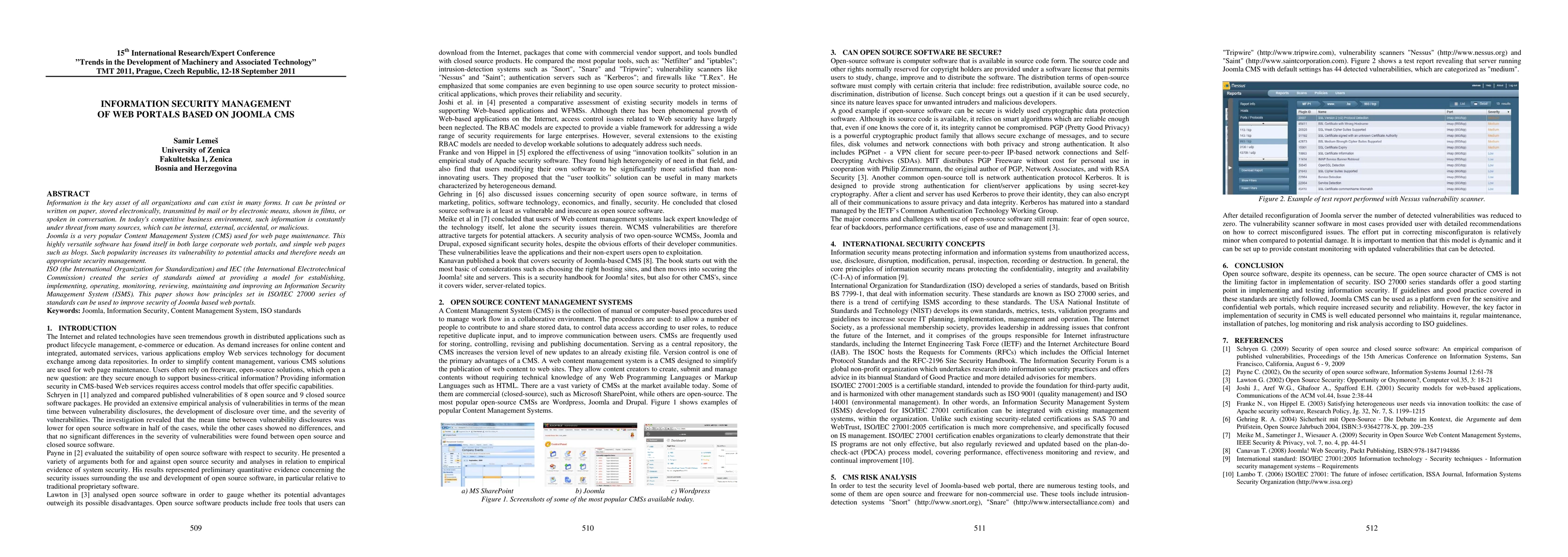Information is the key asset of all organizations and can exist in many forms. It can be printed or written on paper, stored electronically, transmitted by mail or by electronic means, shown in films, or spoken in conversation. In today's competitive business environment, such information is constantly under threat from many sources, which can be internal, external, accidental, or malicious. Joomla is a very popular Content Management System (CMS) used for web page maintenance. This highly versatile software has found itself in both large corporate web portals, and simple web pages such as blogs. Such popularity increases its vulnerability to potential attacks and therefore needs an appropriate security management. ISO (the International Organization for Standardization) and IEC (the International Electrotechnical Commission) created the series of standards aimed at providing a model for establishing, implementing, operating, monitoring, reviewing, maintaining and improving an Information Security Management System (ISMS). This paper shows how principles set in ISO/IEC 27000 series of standards can be used to improve security of Joomla based web portals.