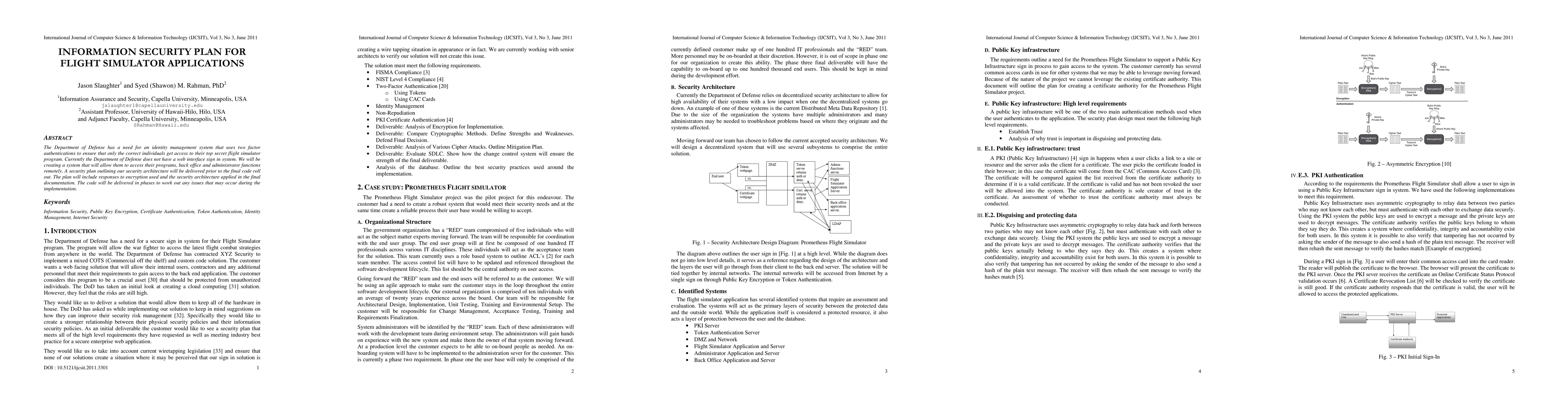 The Department of Defense has a need for an identity management system that uses two factor authentications to ensure that only the correct individuals get access to their top secret flight simulator program. Currently the Department of Defense does not have a web interface sign in system. We will be creating a system that will allow them to access their programs, back office and administrator functions remotely. A security plan outlining our security architecture will be delivered prior to the final code roll out. The plan will include responses to encryption used and the security architecture applied in the final documentation. The code will be delivered in phases to work out any issues that may occur during the implementation