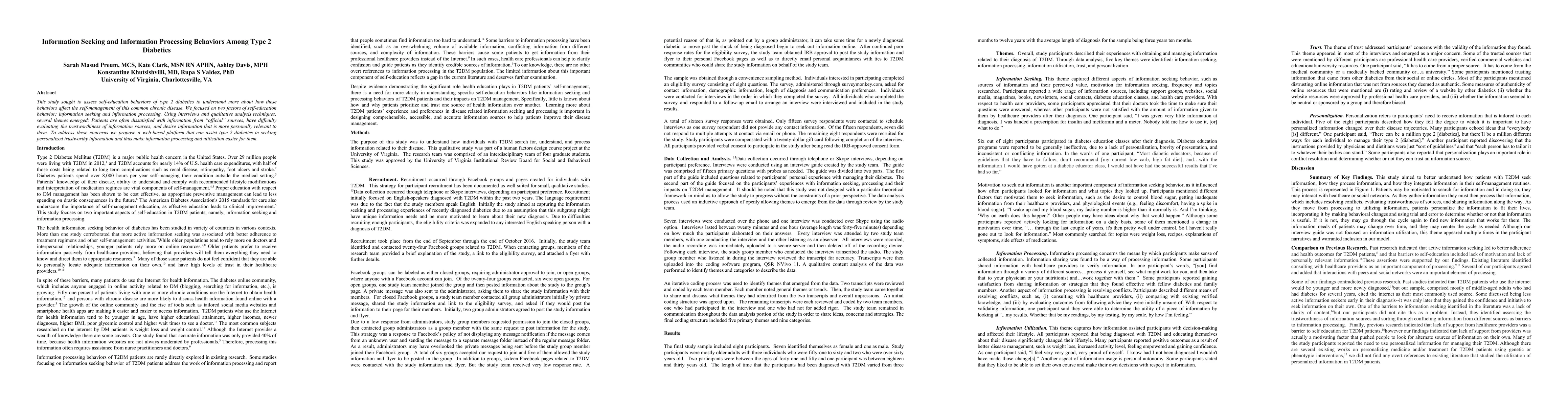 This study explores information seeking and processing behaviors among Type 2 Diabetics, revealing that patients often struggle with evaluating information sources and lack personalized information, leading to difficulties in managing their condition and increased frustration and anxiety. The findings suggest a need for more tailored and consistent information to support self-management.