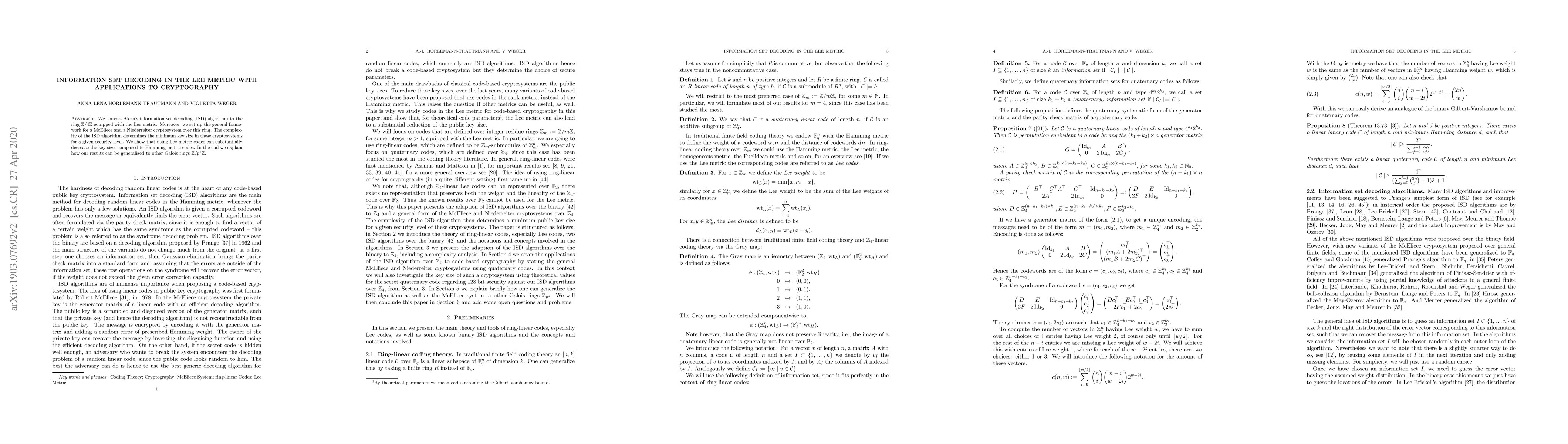 This paper adapts Stern's information set decoding algorithm to the Lee metric over $\mathbb{Z}/4\mathbb{Z}$, establishing frameworks for McEliece and Niederreiter cryptosystems. The use of Lee metric codes significantly reduces key size compared to Hamming metric codes, enhancing security efficiency.