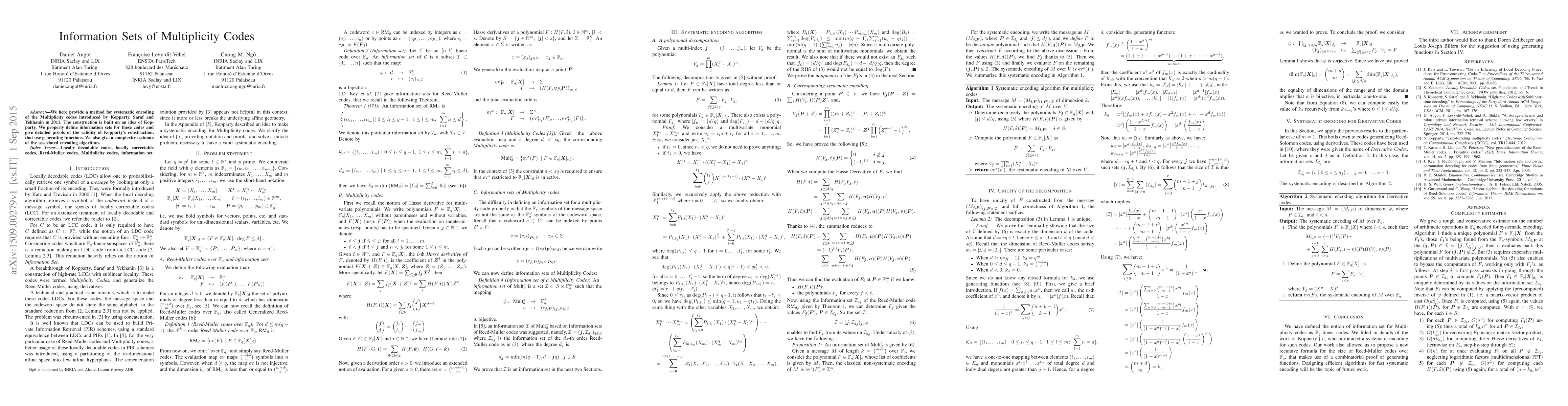 We here provide a method for systematic encoding of the Multiplicity codes introduced by Kopparty, Saraf and Yekhanin in 2011. The construction is built on an idea of Kop-party. We properly define information sets for these codes and give detailed proofs of the validity of Kopparty's construction, that use generating functions. We also give a complexity estimate of the associated encoding algorithm.