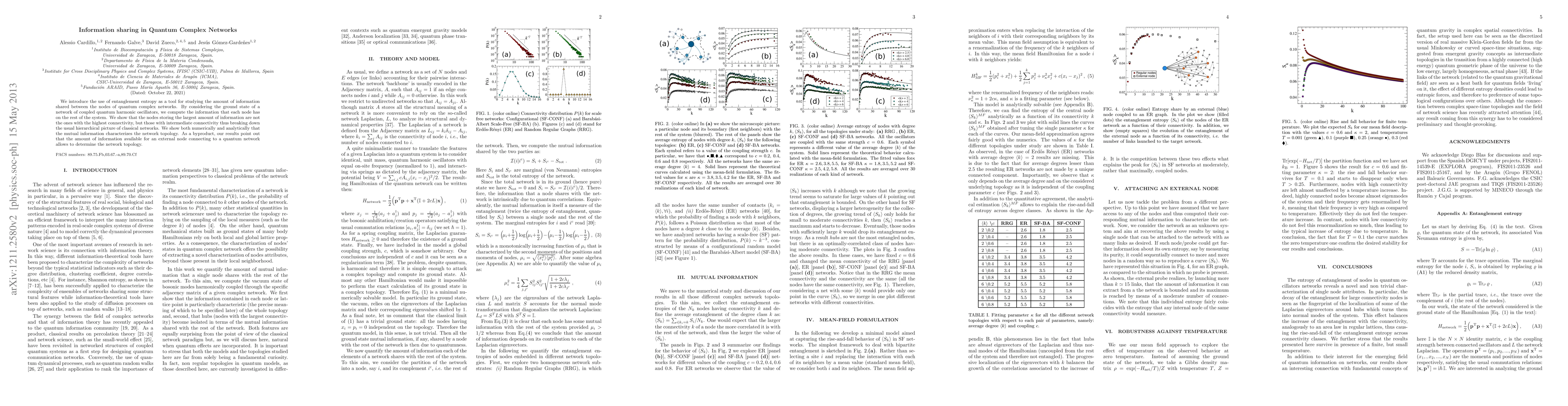 We introduce the use of entanglement entropy as a tool for studying the amount of information shared between the nodes of quantum complex networks. By considering the ground state of a network of coupled quantum harmonic oscillators, we compute the information that each node has on the rest of the system. We show that the nodes storing the largest amount of information are not the ones with the highest connectivity, but those with intermediate connectivity thus breaking down the usual hierarchical picture of classical networks. We show both numerically and analytically that the mutual information characterizes the network topology. As a byproduct, our results point out that the amount of information available for an external node connecting to a quantum network allows to determine the network topology.