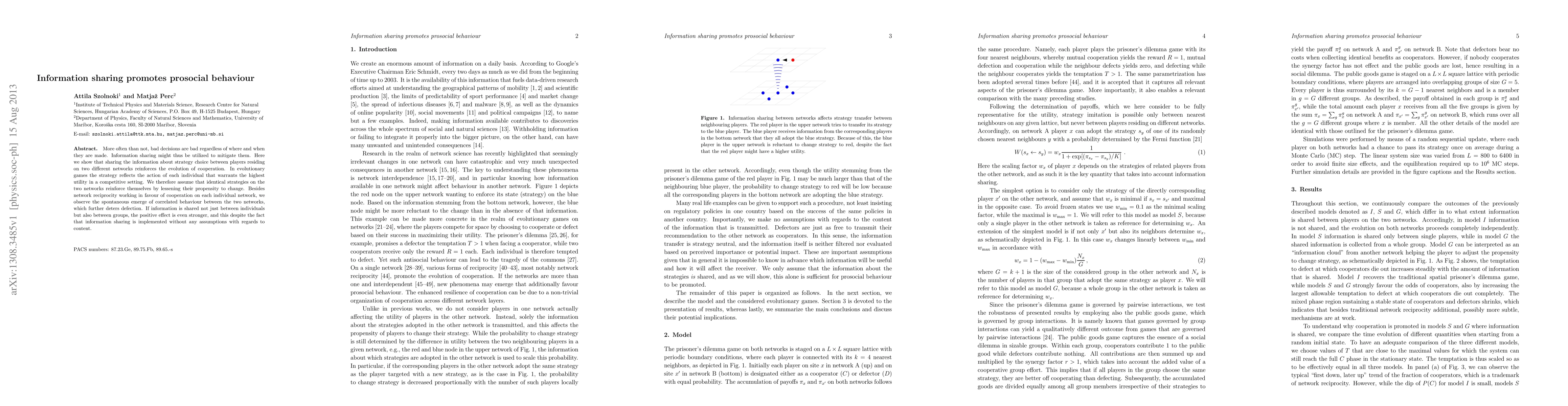 This study demonstrates that sharing information about strategy choices between players on different networks enhances cooperation and reduces defection. The sharing of information, especially between groups, further strengthens prosocial behavior, even without specific content assumptions.