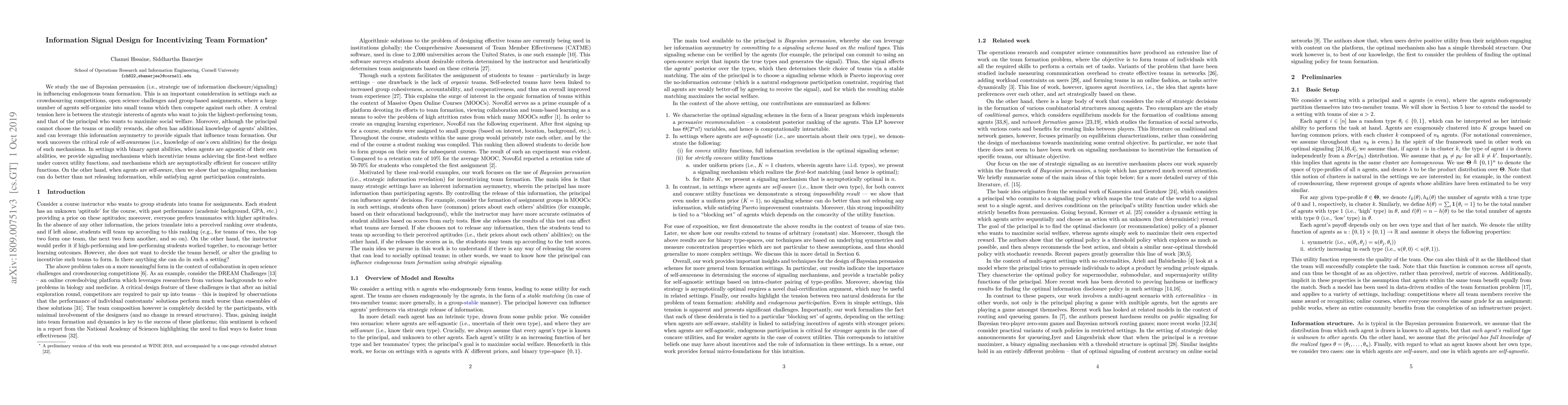 We study the use of Bayesian persuasion (i.e., strategic use of information disclosure/signaling) in endogenous team formation. This is an important consideration in settings such as crowdsourcing competitions, open science challenges and group-based assignments, where a large number of agents organize themselves into small teams which then compete against each other. A central tension here is between the strategic interests of agents who want to have the highest-performing team, and that of the principal who wants teams to be balanced. Moreover, although the principal cannot choose the teams or modify rewards, she often has additional knowledge of agents' abilities, and can leverage this information asymmetry to provide signals that influence team formation. Our work uncovers the critical role of self-awareness (i.e., knowledge of one's own abilities) for the design of such mechanisms. For settings with two-member teams and binary-valued agents partitioned into a constant number of prior classes, we provide signaling mechanisms which are asymptotically optimal when agents are agnostic of their own abilities. On the other hand, when agents are self-aware, then we show that there is no signaling mechanism that can do better than not releasing information, while satisfying agent participation constraints.