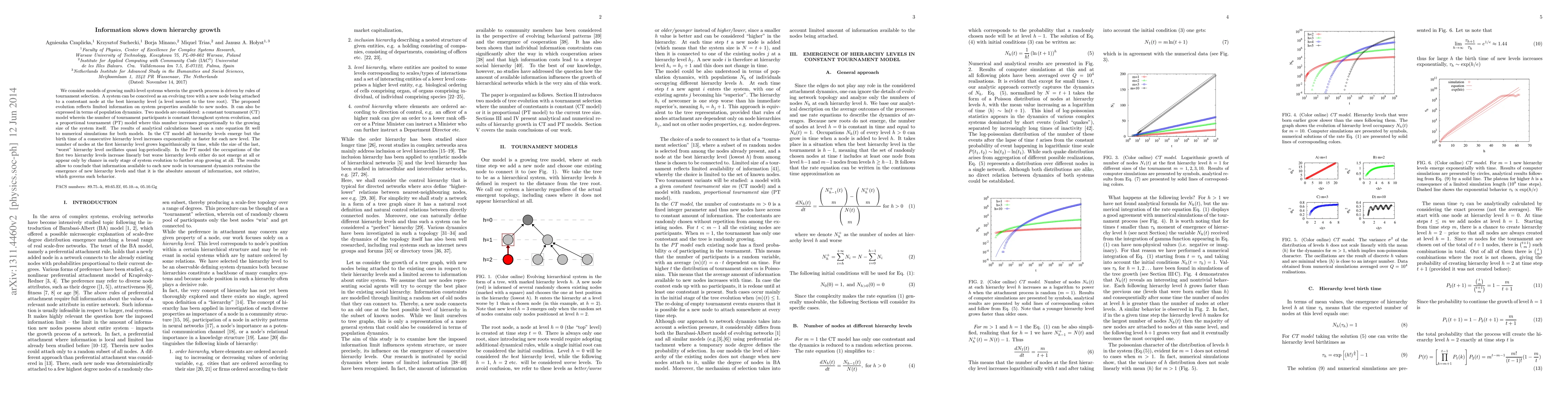 We consider models of growing multi-level systems wherein the growth process is driven by rules of tournament selection. A system can be conceived as an evolving tree with a new node being attached to a contestant node at the best hierarchy level (a level nearest to the tree root). The proposed evolution reflects limited information on system properties available to new nodes. It can also be expressed in terms of population dynamics. Two models are considered: a constant tournament (CT) model wherein the number of tournament participants is constant throughout system evolution, and a proportional tournament (PT) model where this number increases proportionally to the growing size of the system itself. The results of analytical calculations based on a rate equation fit well to numerical simulations for both models. In the CT model all hierarchy levels emerge but the birth time of a consecutive hierarchy level increases exponentially or faster for each new level. The number of nodes at the first hierarchy level grows logarithmically in time, while the size of the last, "worst" hierarchy level oscillates quasi log-periodically. In the PT model the occupations of the first two hierarchy levels increase linearly but worse hierarchy levels either do not emerge at all or appear only by chance in early stage of system evolution to further stop growing at all. The results allow to conclude that information available to each new node in tournament dynamics restrains the emergence of new hierarchy levels and that it is the absolute amount of information, not relative, which governs such behavior.