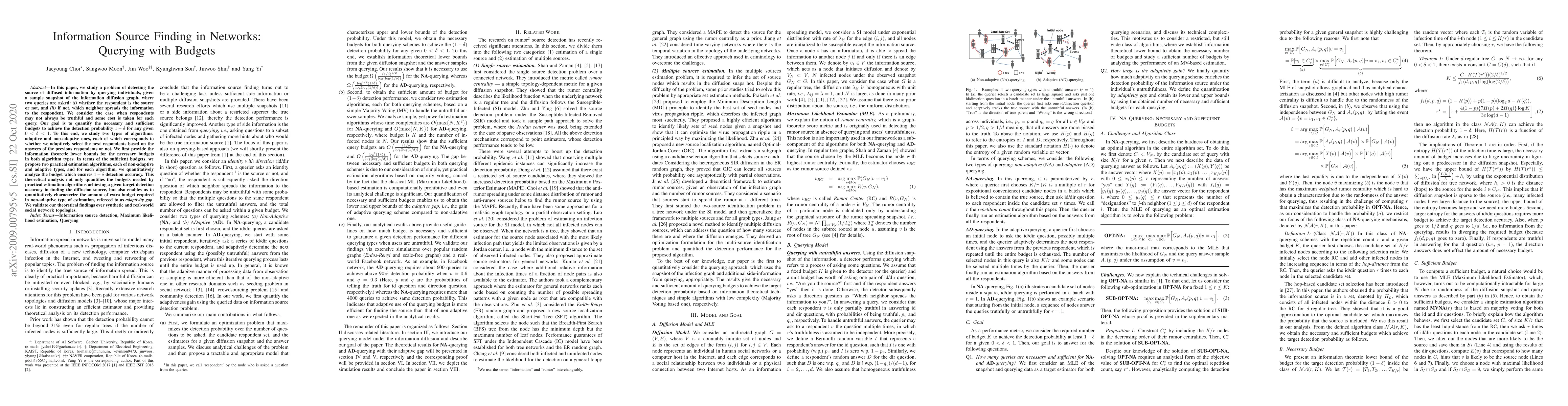 In this paper, we study a problem of detecting the source of diffused information by querying individuals, given a sample snapshot of the information diffusion graph, where two queries are asked: {\em (i)} whether the respondent is the source or not, and {\em (ii)} if not, which neighbor spreads the information to the respondent. We consider the case when respondents may not always be truthful and some cost is taken for each query. Our goal is to quantify the necessary and sufficient budgets to achieve the detection probability $1-\delta$ for any given $0<\delta<1.$ To this end, we study two types of algorithms: adaptive and non-adaptive ones, each of which corresponds to whether we adaptively select the next respondents based on the answers of the previous respondents or not. We first provide the information theoretic lower bounds for the necessary budgets in both algorithm types. In terms of the sufficient budgets, we propose two practical estimation algorithms, each of non-adaptive and adaptive types, and for each algorithm, we quantitatively analyze the budget which ensures $1-\delta$ detection accuracy. This theoretical analysis not only quantifies the budgets needed by practical estimation algorithms achieving a given target detection accuracy in finding the diffusion source, but also enables us to quantitatively characterize the amount of extra budget required in non-adaptive type of estimation, refereed to as {\em adaptivity gap}. We validate our theoretical findings over synthetic and real-world social network topologies.
