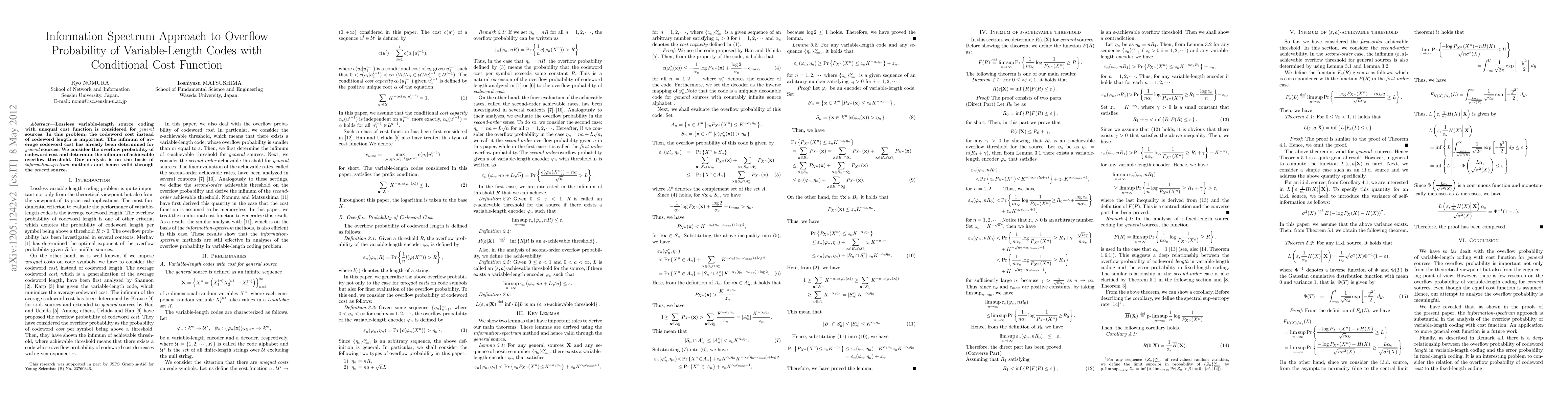 Researchers developed a new method to analyze variable-length codes with unequal cost functions, focusing on the probability of overflow and its relationship to information spectrum. They found the infimum of achievable overflow threshold for general sources.