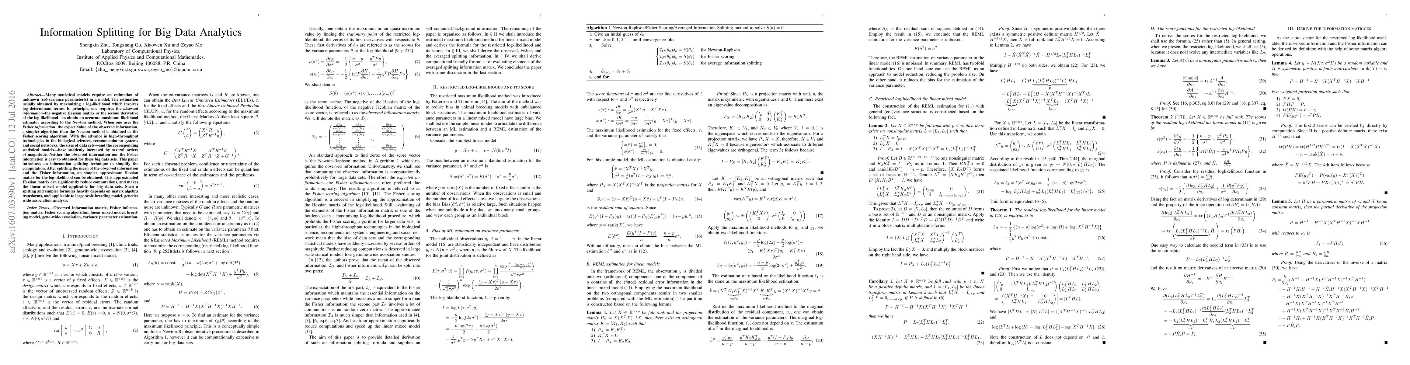 Many statistical models require an estimation of unknown (co)-variance parameter(s) in a model. The estimation usually obtained by maximizing a log-likelihood which involves log determinant terms. In principle, one requires the \emph{observed information}--the negative Hessian matrix or the second derivative of the log-likelihood---to obtain an accurate maximum likelihood estimator according to the Newton method. When one uses the \emph{Fisher information}, the expect value of the observed information, a simpler algorithm than the Newton method is obtained as the Fisher scoring algorithm. With the advance in high-throughput technologies in the biological sciences, recommendation systems and social networks, the sizes of data sets---and the corresponding statistical models---have suddenly increased by several orders of magnitude. Neither the observed information nor the Fisher information is easy to obtained for these big data sets. This paper introduces an information splitting technique to simplify the computation. After splitting the mean of the observed information and the Fisher information, an simpler approximate Hessian matrix for the log-likelihood can be obtained. This approximated Hessian matrix can significantly reduce computations, and makes the linear mixed model applicable for big data sets. Such a spitting and simpler formulas heavily depends on matrix algebra transforms, and applicable to large scale breeding model, genetics wide association analysis.