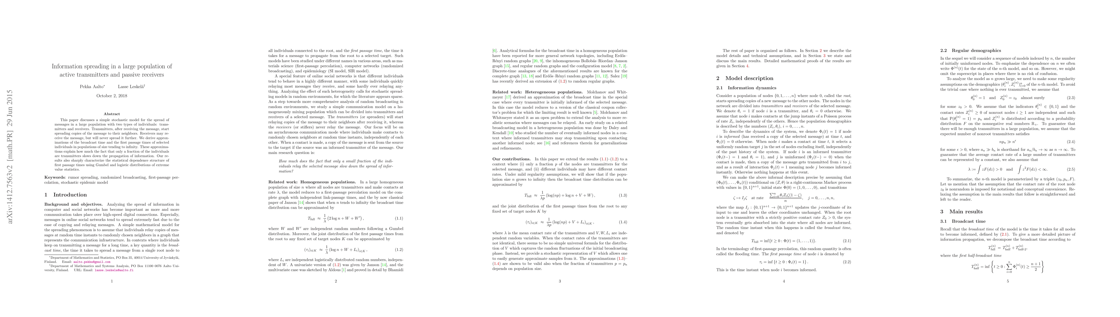 This paper models information spreading in a large population with active transmitters and passive receivers, finding that only a fraction of individuals being transmitters slows down propagation. It also characterizes the statistical dependence structure of first passage times using Gumbel and logistic distributions.