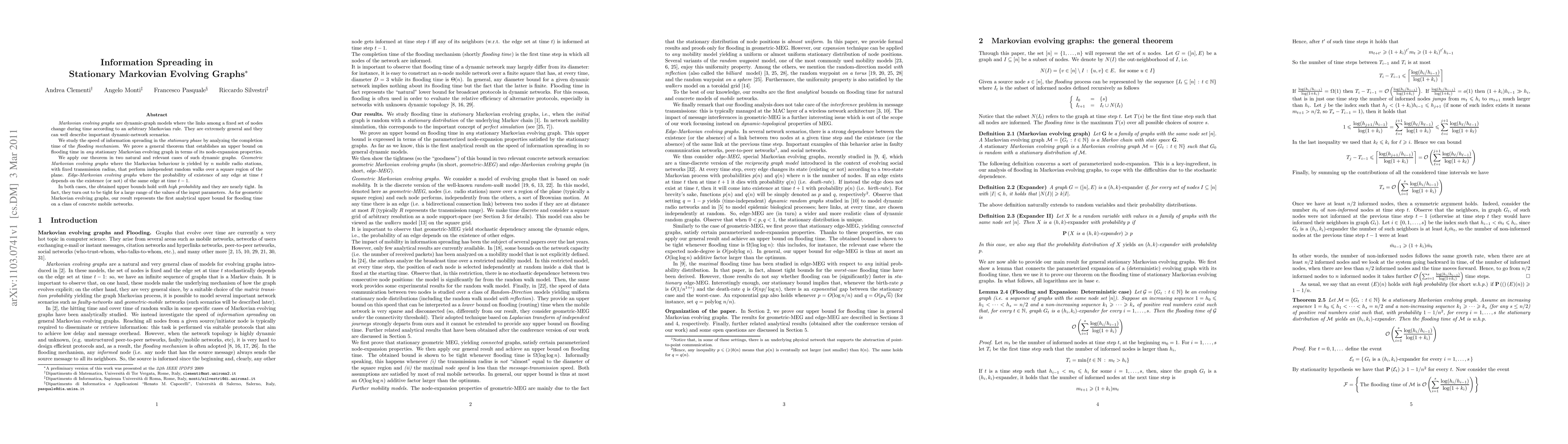 This paper investigates the speed of information spreading in stationary Markovian evolving graphs, proving a theorem that provides an upper bound on flooding time based on node-expansion properties. The authors apply this theorem to two specific cases, yielding tight upper bounds that hold with high probability and represent the first analytical upper bound for flooding time in mobile networks.