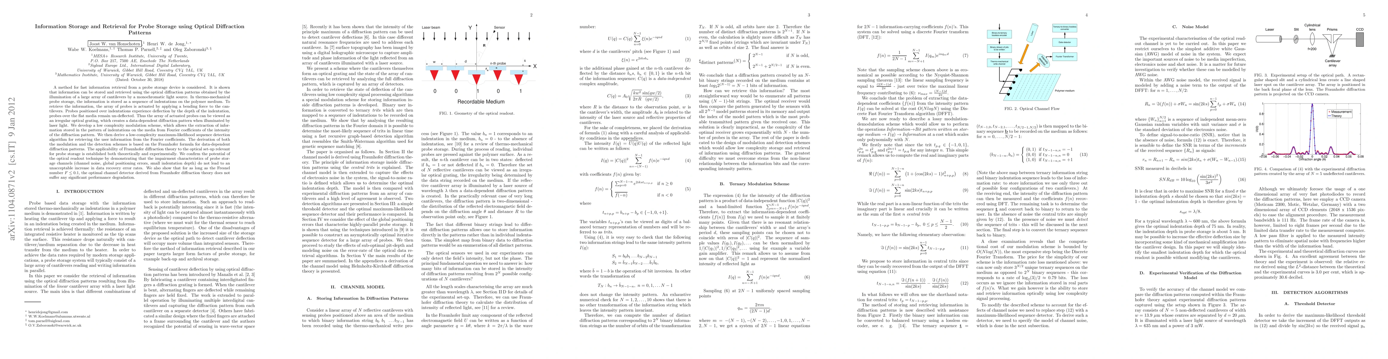 A novel method for fast information retrieval from a probe storage device is considered. It is shown that information can be stored and retrieved using the optical diffraction patterns obtained by the illumination of a large array of cantilevers by a monochromatic light source. In thermo-mechanical probe storage, the information is stored as a sequence of indentations on the polymer medium. To retrieve the information, the array of probes is actuated by applying a bending force to the cantilevers. Probes positioned over indentations experience deflection by the depth of the indentation, probes over the flat media remain un-deflected. Thus the array of actuated probes can be viewed as an irregular optical grating, which creates a data-dependent diffraction pattern when illuminated by laser light. We develop a low complexity modulation scheme, which allows the extraction of information stored in the pattern of indentations on the media from Fourier coefficients of the intensity of the diffraction pattern. We then derive a low-complexity maximum likelihood sequence detection algorithm for retrieving the user information from the Fourier coefficients. The derivation of both the modulation and the detection schemes is based on the Fraunhofer formula for data-dependent diffraction patterns. We show that for as long as the Fresnel number F<0.1, the optimal channel detector derived from Fraunhofer diffraction theory does not suffer any significant performance degradation.
