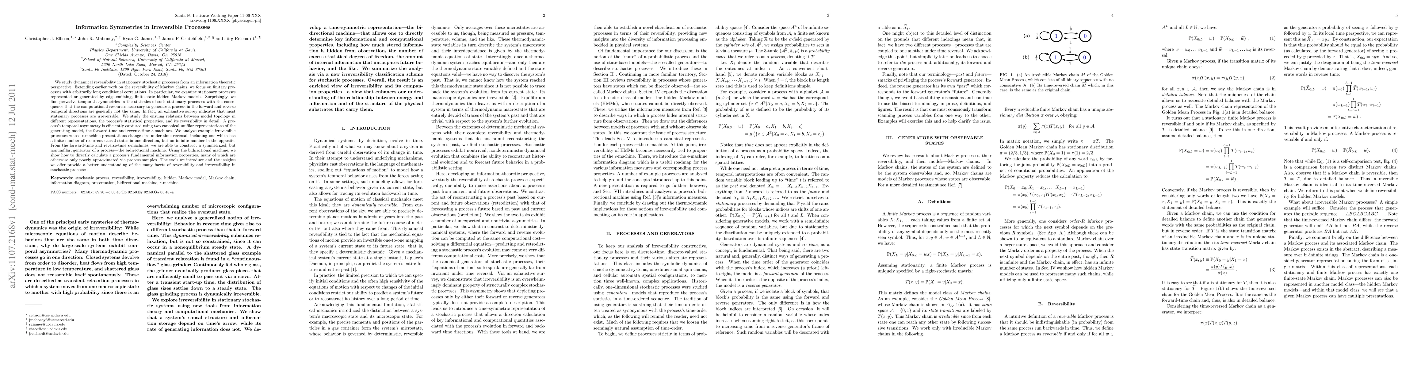 We study dynamical reversibility in stationary stochastic processes from an information theoretic perspective. Extending earlier work on the reversibility of Markov chains, we focus on finitary processes with arbitrarily long conditional correlations. In particular, we examine stationary processes represented or generated by edge-emitting, finite-state hidden Markov models. Surprisingly, we find pervasive temporal asymmetries in the statistics of such stationary processes with the consequence that the computational resources necessary to generate a process in the forward and reverse temporal directions are generally not the same. In fact, an exhaustive survey indicates that most stationary processes are irreversible. We study the ensuing relations between model topology in different representations, the process's statistical properties, and its reversibility in detail. A process's temporal asymmetry is efficiently captured using two canonical unifilar representations of the generating model, the forward-time and reverse-time epsilon-machines. We analyze example irreversible processes whose epsilon-machine presentations change size under time reversal, including one which has a finite number of recurrent causal states in one direction, but an infinite number in the opposite. From the forward-time and reverse-time epsilon-machines, we are able to construct a symmetrized, but nonunifilar, generator of a process---the bidirectional machine. Using the bidirectional machine, we show how to directly calculate a process's fundamental information properties, many of which are otherwise only poorly approximated via process samples. The tools we introduce and the insights we offer provide a better understanding of the many facets of reversibility and irreversibility in stochastic processes.