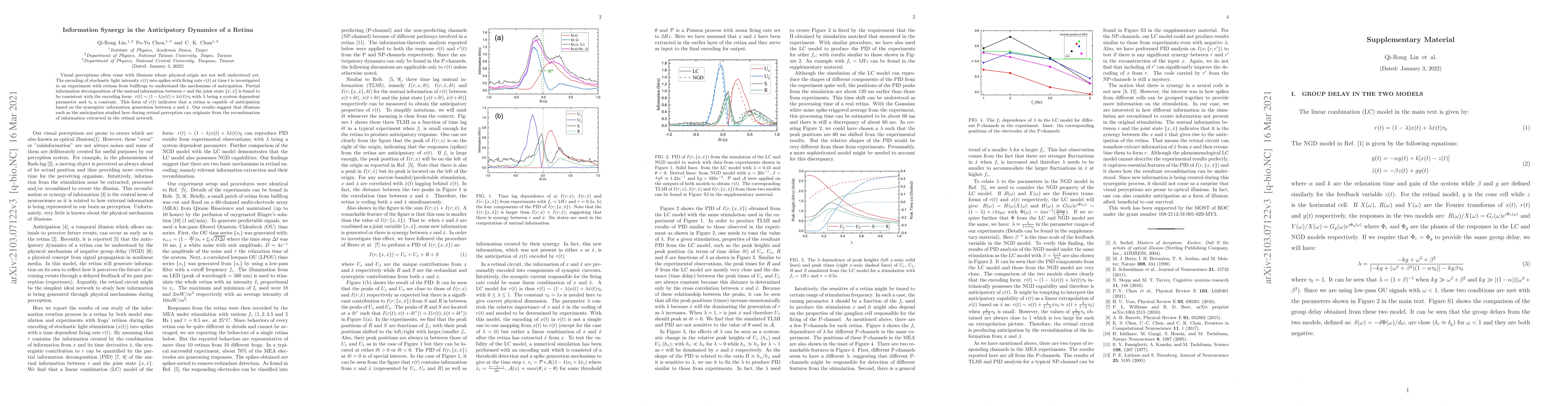 Visual perceptions often come with illusions whose physical origin are not well understood yet. The encoding of stochastic light intensity $x(t)$ into spikes with firing rate $r(t)$ at time $t$ is investigated in an experiment with retinas from bullfrogs to understand the mechanism of anticipation. Partial information decomposition of the mutual information between $r$ and the combined state $\{x,\dot x\}$ is found to be consistent with the encoding form: $r(t) \sim (1-\lambda)x(t) + \lambda \dot x(t) \tau_0$ with $\lambda$ being a system dependent parameter and $\tau_0$ a constant. This form of $r(t)$ indicates that a retina is capable of anticipation based on the synergistic information generation between $x$ and $\dot x$. Our results suggest that illusions such as the anticipation studied here during retinal perception can originate from the recombination of information extracted in the retinal network.