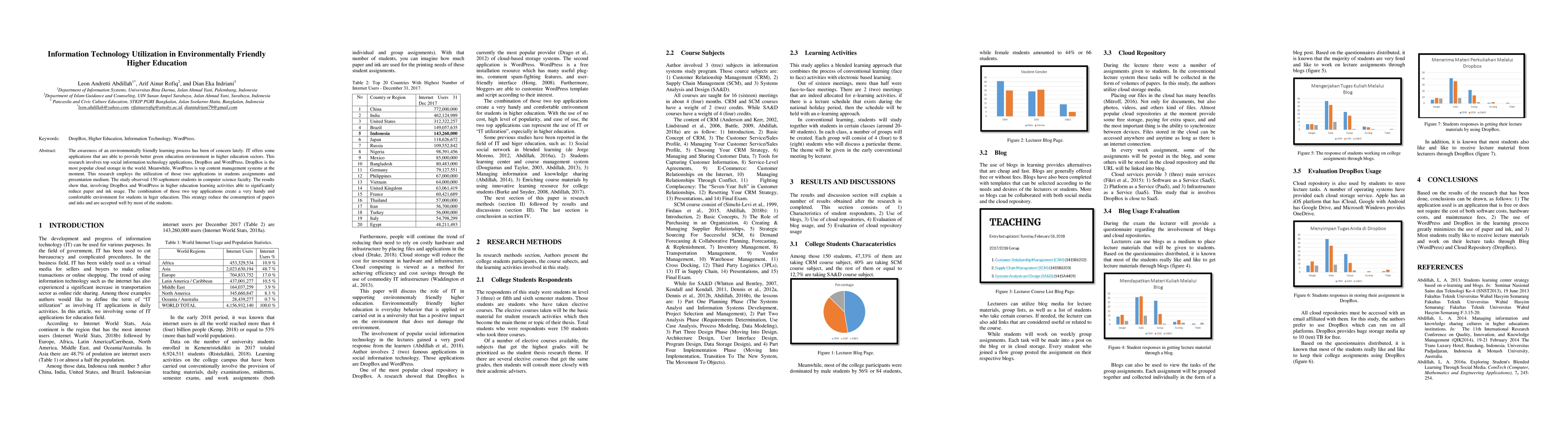 The awareness of an environmentally friendly learning process has been of concern lately. IT offers some applications that are able to provide better green education environment in higher education sectors. This research involves top social information technology applications, DropBox and WordPress. DropBox is the most popular cloud storage in the world. Meanwhile, WordPress is top content management systems at the moment. This research employs the utilization of those two applications in students assignments and presentation medium. The study observed 150 sophomore students in computer science faculty. The results show that, involving DropBox and WordPress in higher education learning activities able to significantly reduce paper and ink usage. The combination of those two top applications create a very handy and comfortable environment for students in higer education. This strategy reduce the consumption of papers and inks and are accepted well by most of the students.