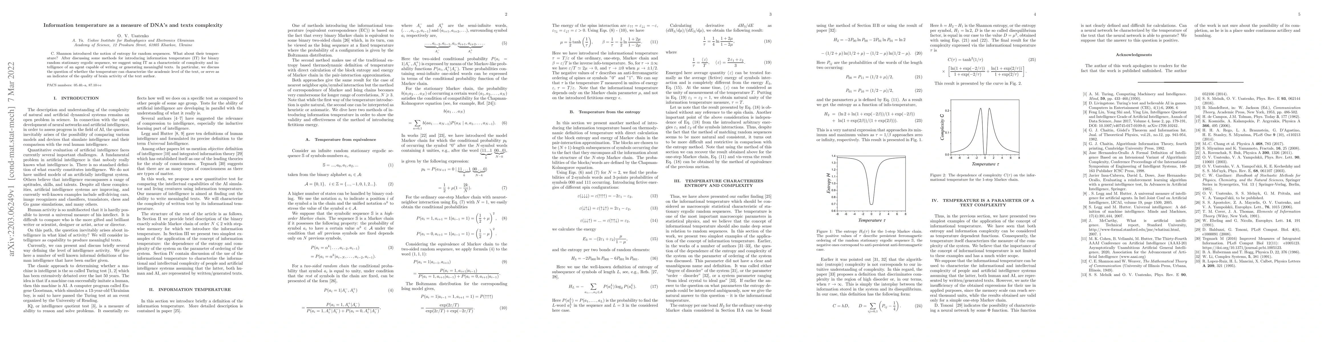 C. Shannon introduced the notion of entropy for random sequences. What about their temperature? After discussing some methods for introducing information temperature (IT) for binary random stationary ergodic sequence, we suggest using IT as a characteristic of complexity and intelligence of an agent capable of writing or generating meaningful texts. In particular, we discuss the question of whether the temperature can characterize the academic level of the text, or serve as an indicator of the quality of brain activity of the text author.