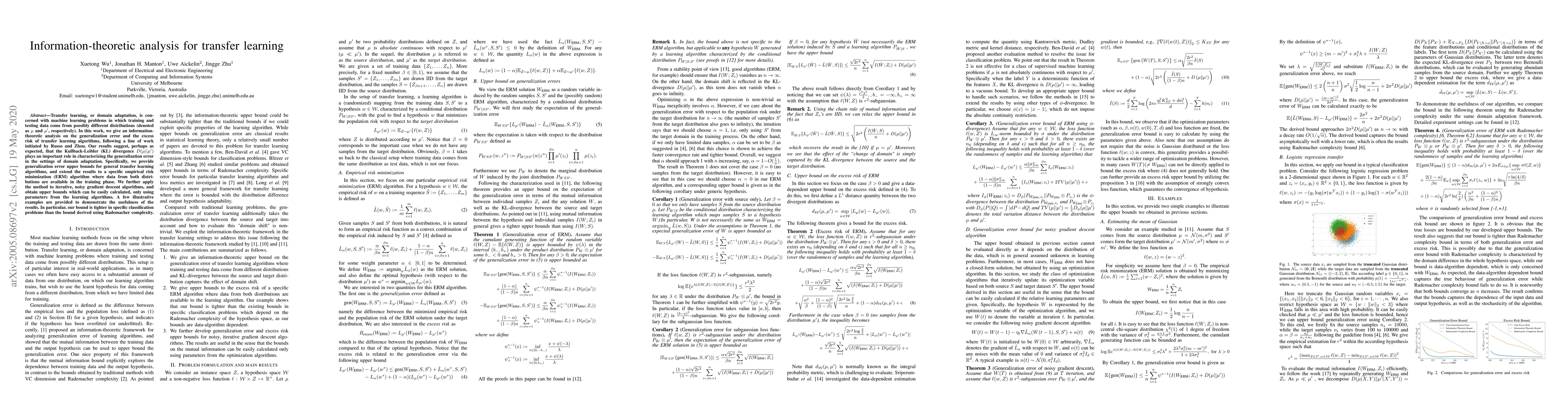 This research paper presents an information-theoretic analysis of transfer learning, showing that KL divergence between source and target distributions significantly impacts generalization error. It provides upper bounds for general transfer learning algorithms and ERM, extending to iterative gradient descent methods. These bounds, demonstrated through examples, are often tighter than those from Rademacher complexity in classification problems.