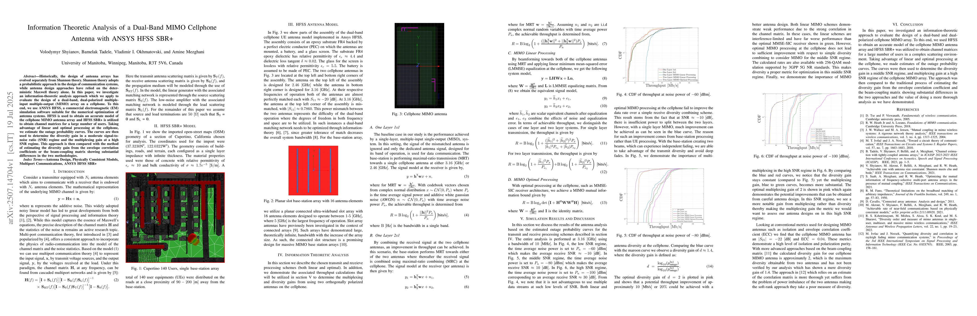 Historically, the design of antenna arrays has evolved separately from Shannon theory. Shannon theory adopts a probabilistic approach in the design of communication systems, while antenna design approaches have relied on the deterministic Maxwell theory alone. In this paper, we investigate an information-theoretic analysis approach which we apply to evaluate the design of a dual-band, dual-polarized multiple-input multiple-output (MIMO) array on a cellphone. To this end, we use ANSYS HFSS, a commercial electromagnetic (EM) simulation software suitable for the numerical optimization of antenna systems. HFSS is used to obtain an accurate model of the cellphone MIMO antenna array and HFSS SBR+ is utilized to obtain channel matrices for a large number of users. Taking advantage of linear and optimal processing at the cellphone, we estimate the outage probability curves. The curves are then used to determine the diversity gain in a moderate signal-to-noise ratio (SNR) regime and the multiplexing gain at a high SNR regime. This approach is then compared with the method of estimating the diversity gain from the envelope correlation coefficients or the beam-coupling matrix showing substantial differences in the two methodologies.