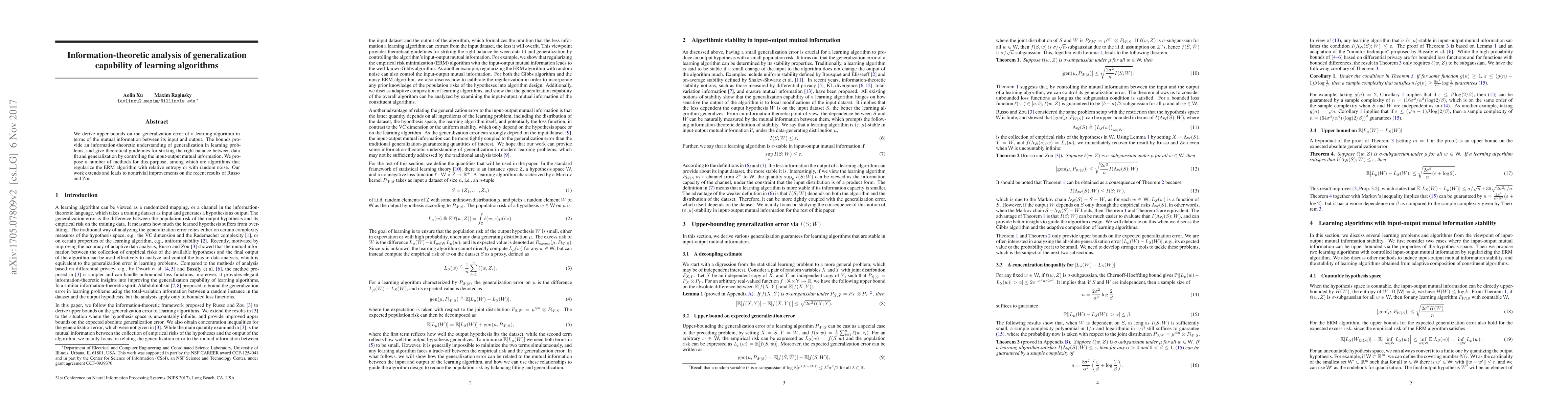 We derive upper bounds on the generalization error of a learning algorithm in terms of the mutual information between its input and output. The bounds provide an information-theoretic understanding of generalization in learning problems, and give theoretical guidelines for striking the right balance between data fit and generalization by controlling the input-output mutual information. We propose a number of methods for this purpose, among which are algorithms that regularize the ERM algorithm with relative entropy or with random noise. Our work extends and leads to nontrivial improvements on the recent results of Russo and Zou.