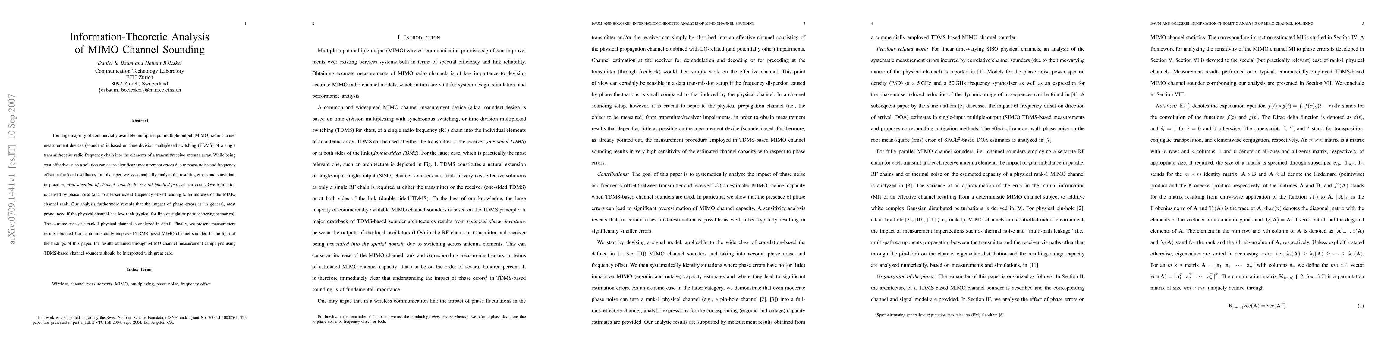 The large majority of commercially available multiple-input multiple-output (MIMO) radio channel measurement devices (sounders) is based on time-division multiplexed switching (TDMS) of a single transmit/receive radio-frequency chain into the elements of a transmit/receive antenna array. While being cost-effective, such a solution can cause significant measurement errors due to phase noise and frequency offset in the local oscillators. In this paper, we systematically analyze the resulting errors and show that, in practice, overestimation of channel capacity by several hundred percent can occur. Overestimation is caused by phase noise (and to a lesser extent frequency offset) leading to an increase of the MIMO channel rank. Our analysis furthermore reveals that the impact of phase errors is, in general, most pronounced if the physical channel has low rank (typical for line-of-sight or poor scattering scenarios). The extreme case of a rank-1 physical channel is analyzed in detail. Finally, we present measurement results obtained from a commercially employed TDMS-based MIMO channel sounder. In the light of the findings of this paper, the results obtained through MIMO channel measurement campaigns using TDMS-based channel sounders should be interpreted with great care.