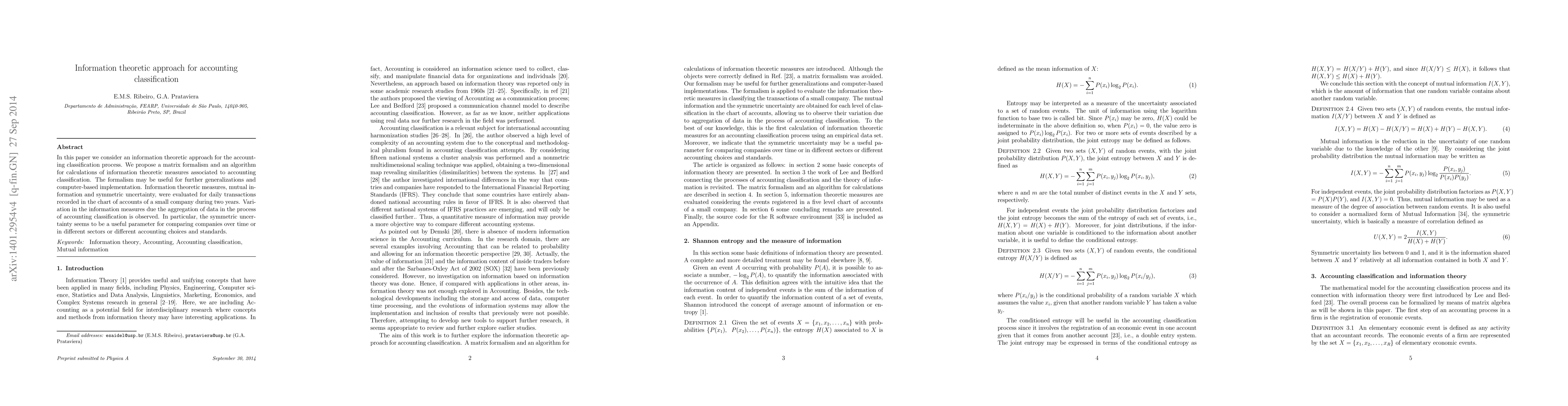 This paper proposes an information theoretic approach for accounting classification using a matrix formalism and algorithm to calculate mutual information and symmetric uncertainty. The study finds that symmetric uncertainty is particularly useful for comparing companies over time or across different sectors and accounting standards.