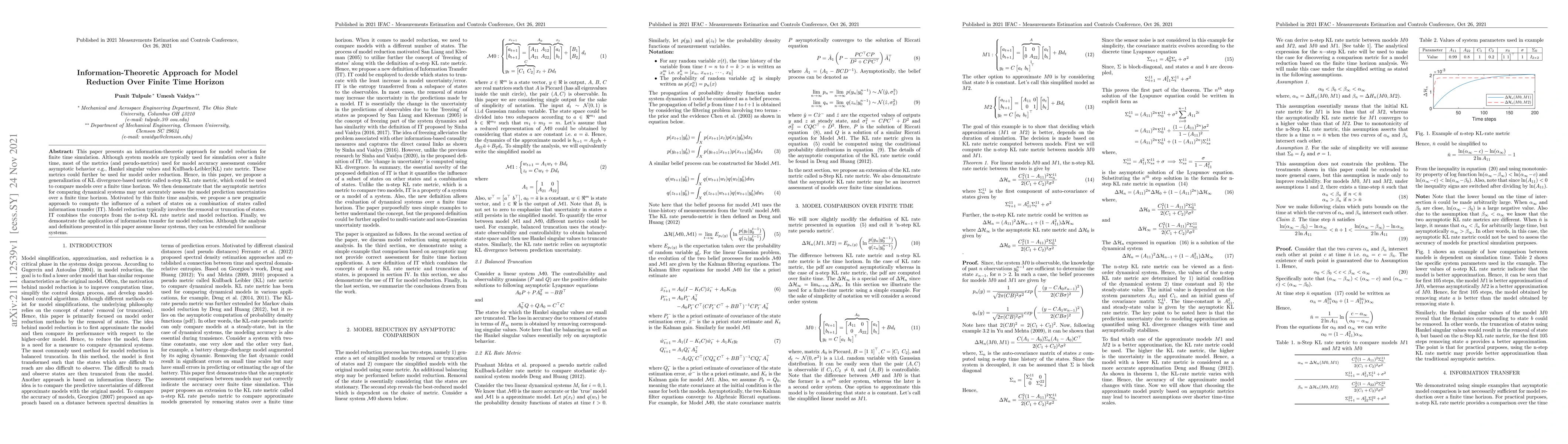 This paper presents an information-theoretic approach for model reduction for finite time simulation. Although system models are typically used for simulation over a finite time, most of the metrics (and pseudo-metrics) used for model accuracy assessment consider asymptotic behavior e.g., Hankel singular values and Kullback-Leibler(KL) rate metric. These metrics could further be used for model order reduction. Hence, in this paper, we propose a generalization of KL divergence-based metric called n-step KL rate metric, which could be used to compare models over a finite time horizon. We then demonstrate that the asymptotic metrics for comparing dynamical systems may not accurately assess the model prediction uncertainties over a finite time horizon. Motivated by this finite time analysis, we propose a new pragmatic approach to compute the influence of a subset of states on a combination of states called information transfer (IT). Model reduction typically involves the removal or truncation of states. IT combines the concepts from the n-step KL rate metric and model reduction. Finally, we demonstrate the application of information transfer for model reduction. Although the analysis and definitions presented in this paper assume linear systems, they can be extended for nonlinear systems.