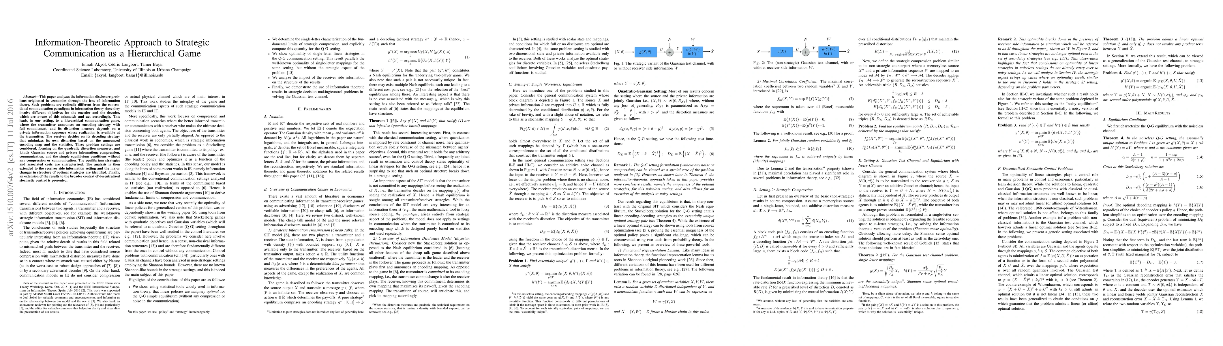 This paper applies information theory to strategic communication in hierarchical games, analyzing optimal strategies for encoding and decoding with quadratic distortion measures. It presents key findings on equilibrium conditions and their implications for decentralized stochastic control.