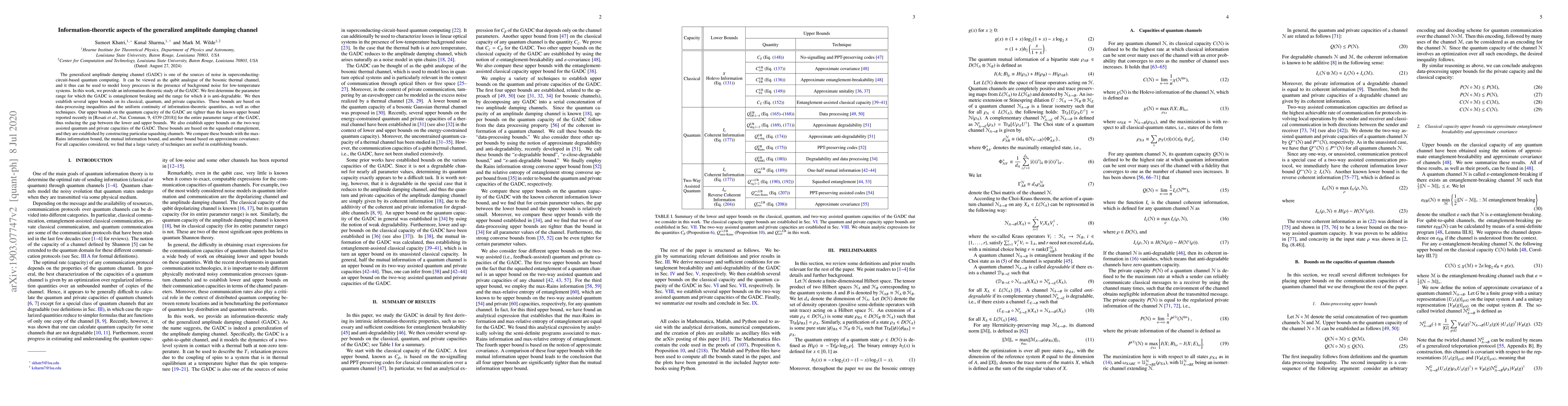 The generalized amplitude damping channel (GADC) is one of the sources of noise in superconducting-circuit-based quantum computing. It can be viewed as the qubit analogue of the bosonic thermal channel, and it thus can be used to model lossy processes in the presence of background noise for low-temperature systems. In this work, we provide an information-theoretic study of the GADC. We first determine the parameter range for which the GADC is entanglement breaking and the range for which it is anti-degradable. We then establish several upper bounds on its classical, quantum, and private capacities. These bounds are based on data-processing inequalities and the uniform continuity of information-theoretic quantities, as well as other techniques. Our upper bounds on the quantum capacity of the GADC are tighter than the known upper bound reported recently in [Rosati et al., Nat. Commun. 9, 4339 (2018)] for the entire parameter range of the GADC, thus reducing the gap between the lower and upper bounds. We also establish upper bounds on the two-way assisted quantum and private capacities of the GADC. These bounds are based on the squashed entanglement, and they are established by constructing particular squashing channels. We compare these bounds with the max-Rains information bound, the mutual information bound, and another bound based on approximate covariance. For all capacities considered, we find that a large variety of techniques are useful in establishing bounds.