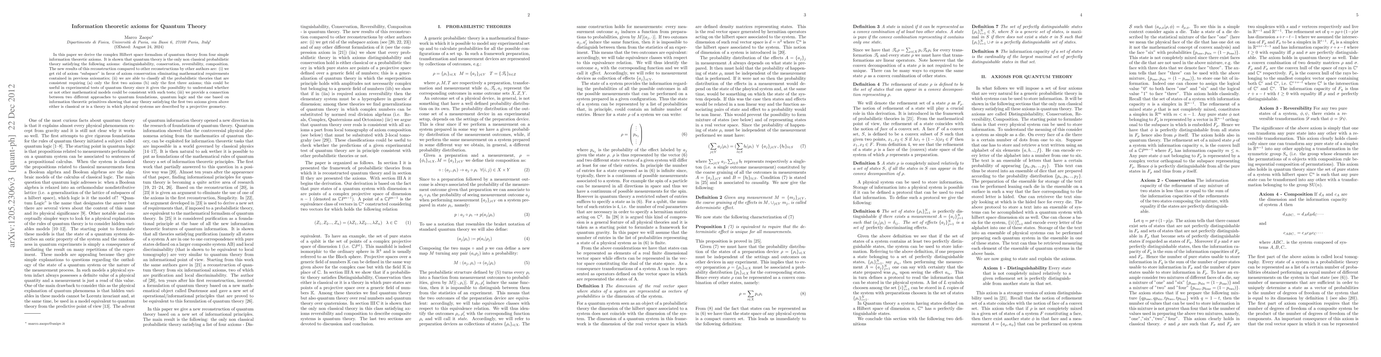 This paper derives quantum theory from four information theoretic axioms: distinguishability, conservation, reversibility, and composition, eliminating the "subspace" axiom. It classifies consistent probabilistic theories based on subsets of these axioms and connects quantum logic with information-theoretic foundations.