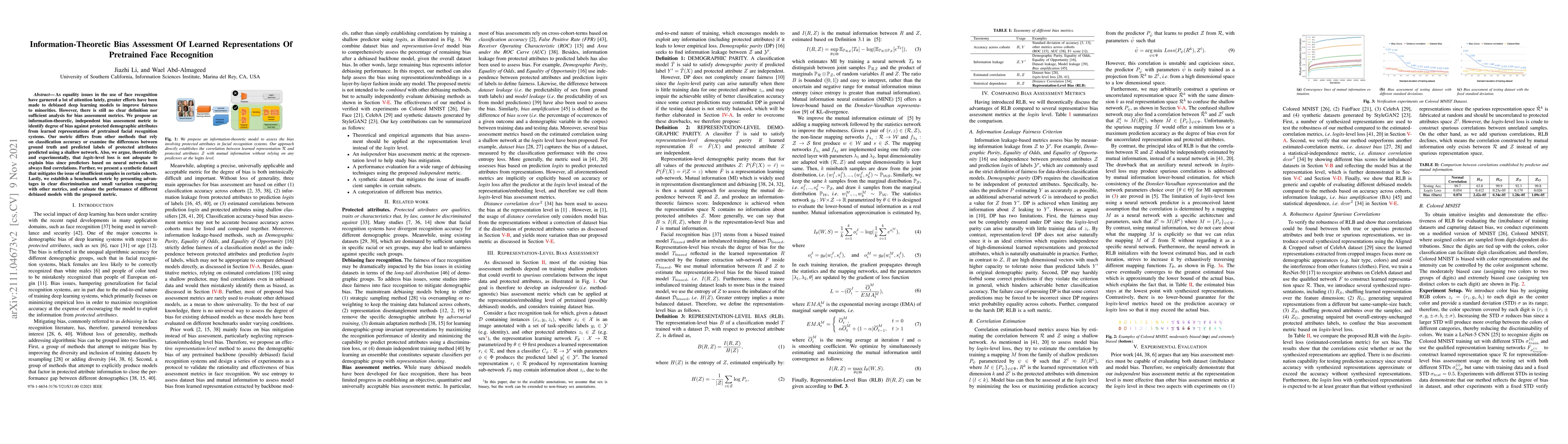 As equality issues in the use of face recognition have garnered a lot of attention lately, greater efforts have been made to debiased deep learning models to improve fairness to minorities. However, there is still no clear definition nor sufficient analysis for bias assessment metrics. We propose an information-theoretic, independent bias assessment metric to identify degree of bias against protected demographic attributes from learned representations of pretrained facial recognition systems. Our metric differs from other methods that rely on classification accuracy or examine the differences between ground truth and predicted labels of protected attributes predicted using a shallow network. Also, we argue, theoretically and experimentally, that logits-level loss is not adequate to explain bias since predictors based on neural networks will always find correlations. Further, we present a synthetic dataset that mitigates the issue of insufficient samples in certain cohorts. Lastly, we establish a benchmark metric by presenting advantages in clear discrimination and small variation comparing with other metrics, and evaluate the performance of different debiased models with the proposed metric.