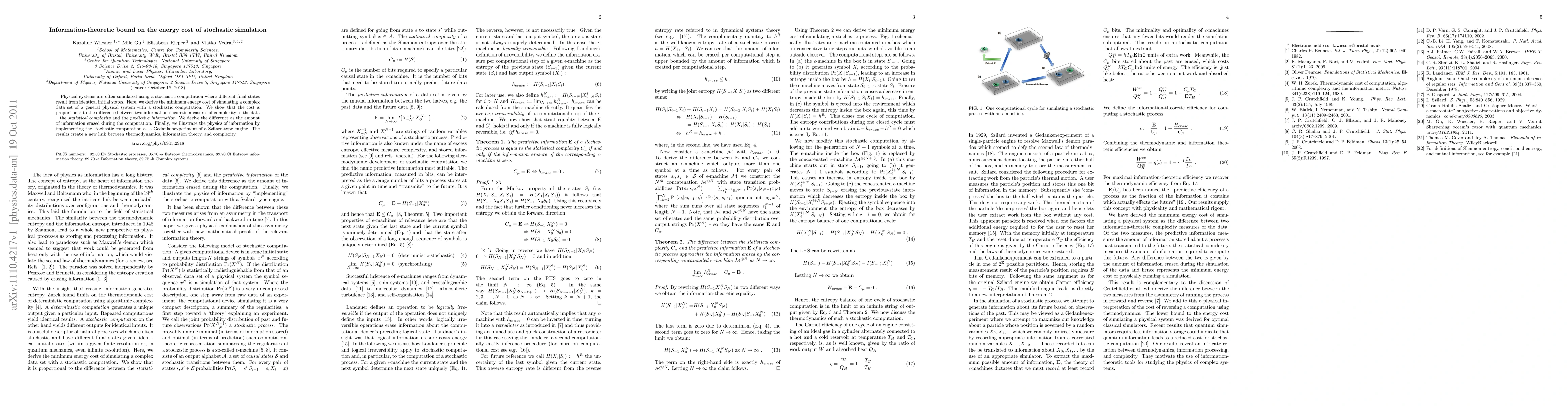 Physical systems are often simulated using a stochastic computation where different final states result from identical initial states. Here, we derive the minimum energy cost of simulating a complex data set of a general physical system with a stochastic computation. We show that the cost is proportional to the difference between two information-theoretic measures of complexity of the data - the statistical complexity and the predictive information. We derive the difference as the amount of information erased during the computation. Finally, we illustrate the physics of information by implementing the stochastic computation as a Gedankenexperiment of a Szilard-type engine. The results create a new link between thermodynamics, information theory, and complexity.