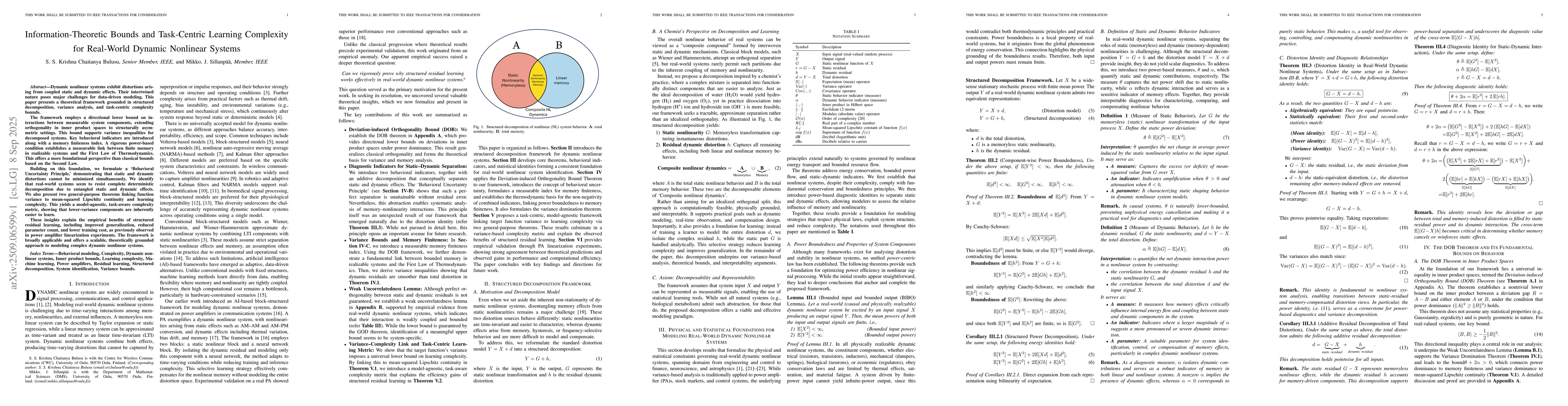 Dynamic nonlinear systems exhibit distortions arising from coupled static and dynamic effects. Their intertwined nature poses major challenges for data-driven modeling. This paper presents a theoretical framework grounded in structured decomposition, variance analysis, and task-centric complexity bounds. The framework employs a directional lower bound on interactions between measurable system components, extending orthogonality in inner product spaces to structurally asymmetric settings. This bound supports variance inequalities for decomposed systems. Key behavioral indicators are introduced along with a memory finiteness index. A rigorous power-based condition establishes a measurable link between finite memory in realizable systems and the First Law of Thermodynamics. This offers a more foundational perspective than classical bounds based on the Second Law. Building on this foundation, we formulate a `Behavioral Uncertainty Principle,' demonstrating that static and dynamic distortions cannot be minimized simultaneously. We identify that real-world systems seem to resist complete deterministic decomposition due to entangled static and dynamic effects. We also present two general-purpose theorems linking function variance to mean-squared Lipschitz continuity and learning complexity. This yields a model-agnostic, task-aware complexity metric, showing that lower-variance components are inherently easier to learn. These insights explain the empirical benefits of structured residual learning, including improved generalization, reduced parameter count, and lower training cost, as previously observed in power amplifier linearization experiments. The framework is broadly applicable and offers a scalable, theoretically grounded approach to modeling complex dynamic nonlinear systems.
