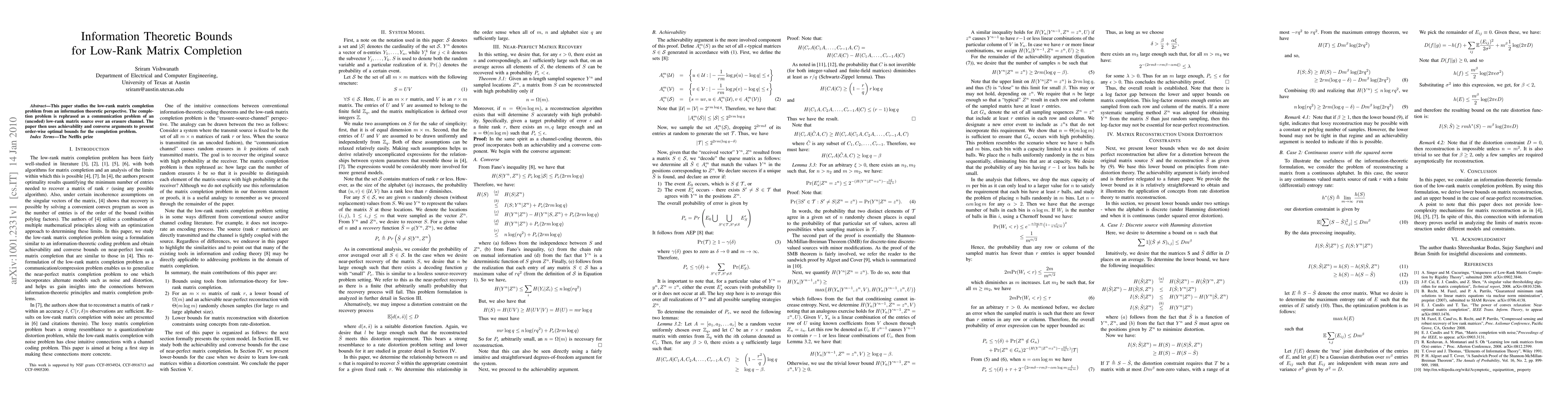 The paper presents information-theoretic bounds for low-rank matrix completion, combining channel coding theorems with matrix completion problems.