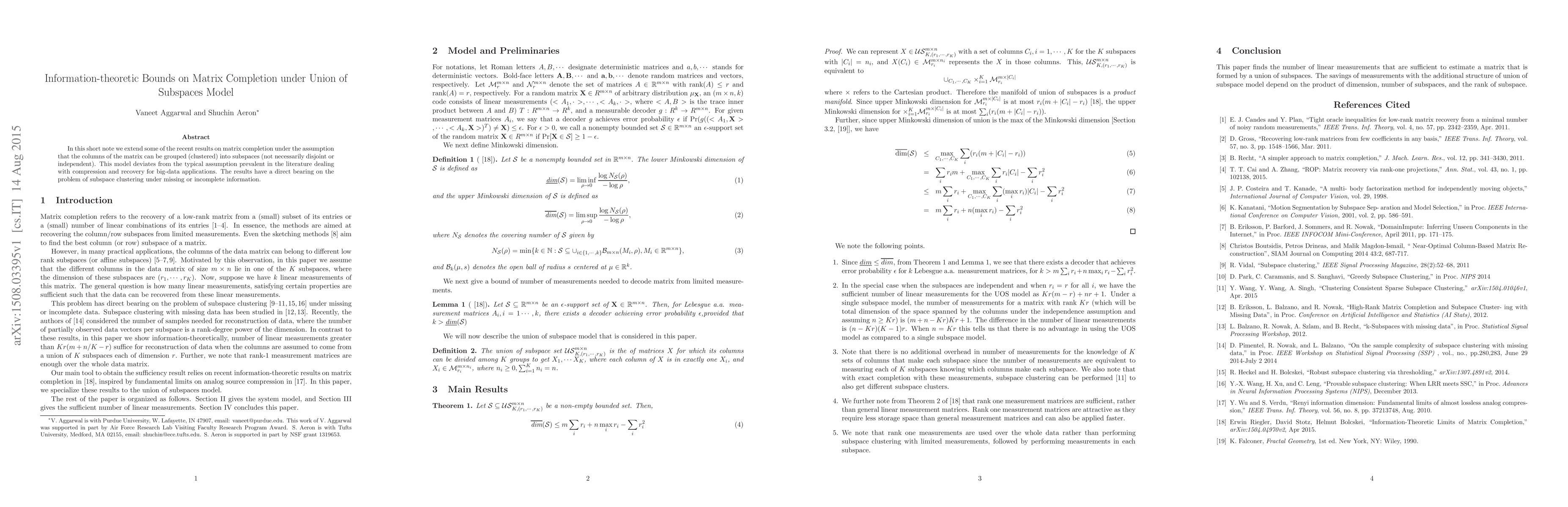 This paper extends matrix completion results to a model where columns can be grouped into subspaces, improving recovery from incomplete information. It has implications for subspace clustering under missing data.