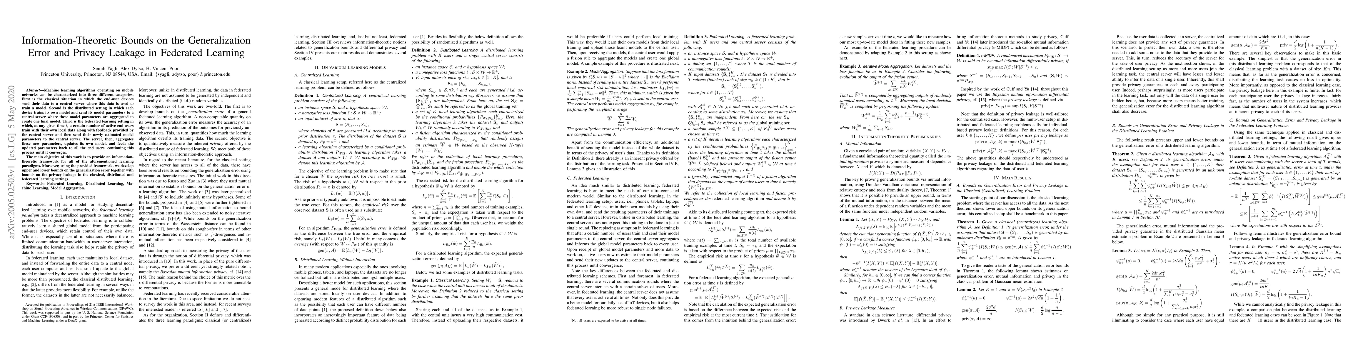This paper develops an information-theoretic framework for analyzing classical, distributed, and federated learning paradigms. It provides bounds on generalization error and privacy leakage for each learning setting, offering insights into their respective efficiencies and privacy implications.