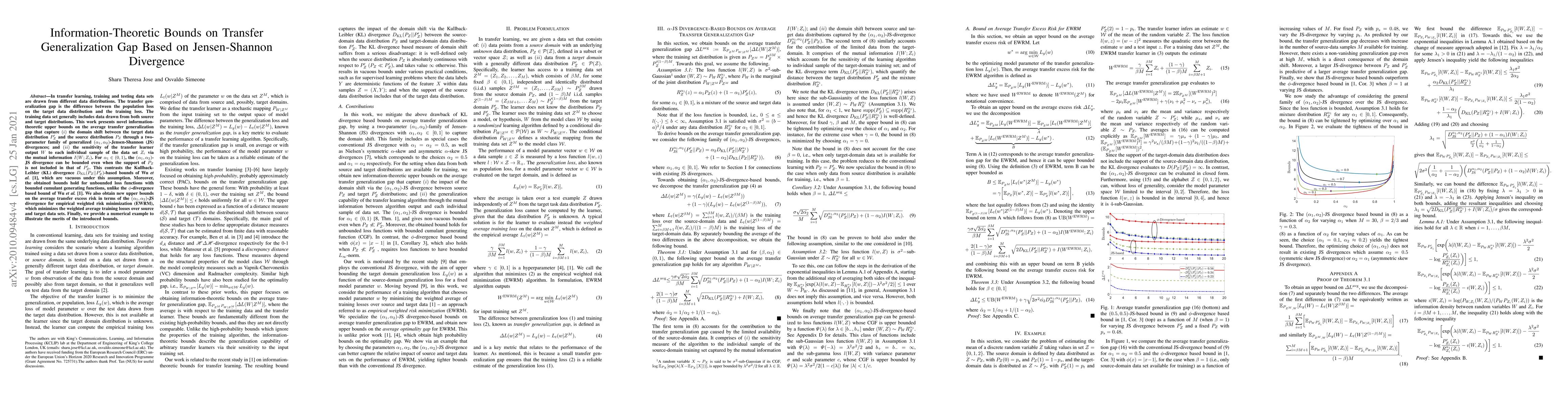 This paper presents novel information-theoretic upper bounds on the transfer generalization gap in transfer learning, utilizing $(\alpha_1,\alpha_2)$-Jensen-Shannon divergence to account for domain shift and mutual information to measure sensitivity. These bounds are more general than previous KL divergence-based methods and apply to unbounded loss functions.