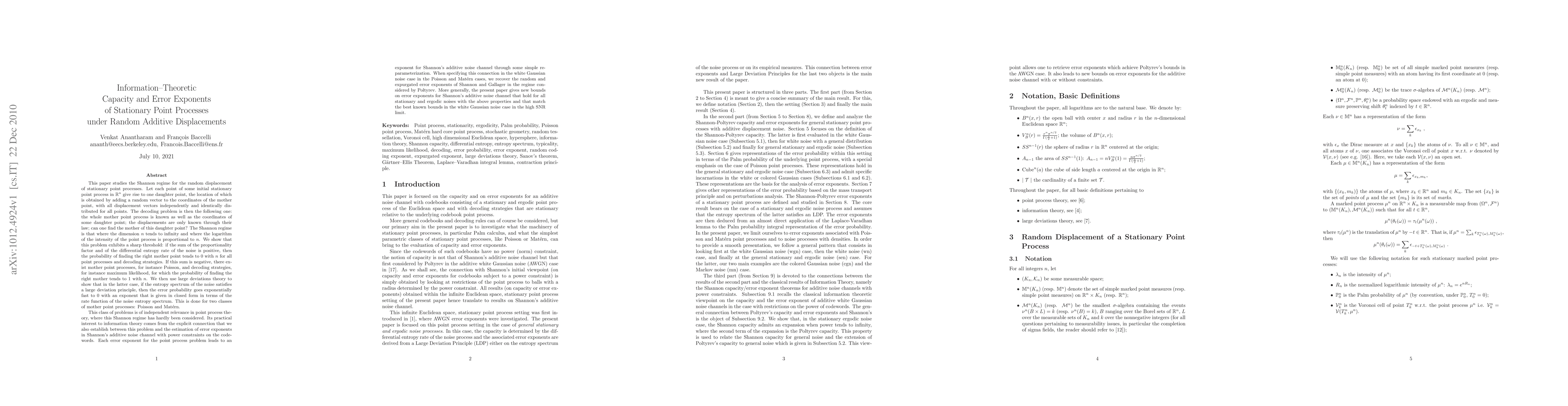 This paper studies the Shannon regime for the random displacement of stationary point processes. Let each point of some initial stationary point process in $\R^n$ give rise to one daughter point, the location of which is obtained by adding a random vector to the coordinates of the mother point, with all displacement vectors independently and identically distributed for all points. The decoding problem is then the following one: the whole mother point process is known as well as the coordinates of some daughter point; the displacements are only known through their law; can one find the mother of this daughter point? The Shannon regime is that where the dimension $n$ tends to infinity and where the logarithm of the intensity of the point process is proportional to $n$. We show that this problem exhibits a sharp threshold: if the sum of the proportionality factor and of the differential entropy rate of the noise is positive, then the probability of finding the right mother point tends to 0 with $n$ for all point processes and decoding strategies. If this sum is negative, there exist mother point processes, for instance Poisson, and decoding strategies, for instance maximum likelihood, for which the probability of finding the right mother tends to 1 with $n$. We then use large deviations theory to show that in the latter case, if the entropy spectrum of the noise satisfies a large deviation principle, then the error probability goes exponentially fast to 0 with an exponent that is given in closed form in terms of the rate function of the noise entropy spectrum. This is done for two classes of mother point processes: Poisson and Mat\'ern. The practical interest to information theory comes from the explicit connection that we also establish between this problem and the estimation of error exponents in Shannon's additive noise channel with power constraints on the codewords.