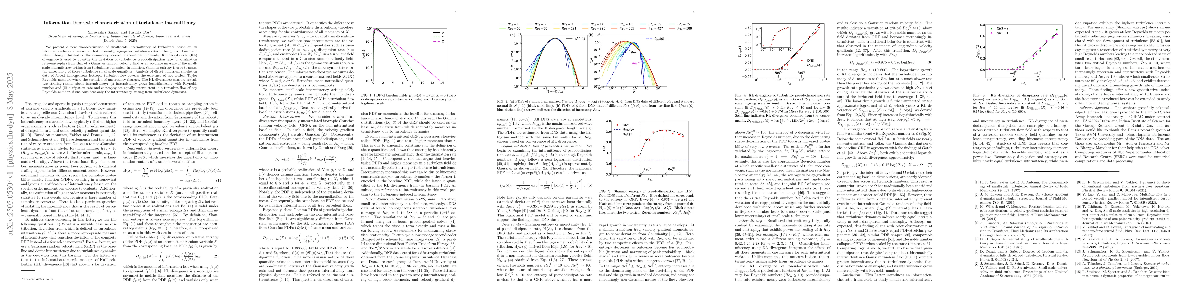 This paper introduces an information-theoretic approach using Kullback-Leibler divergence to characterize turbulence intermittency, distinguishing it from kinematic intermittency. It finds that intermittency grows logarithmically with Reynolds number and that dissipation rate and enstrophy exhibit equal intermittency due to turbulence dynamics.