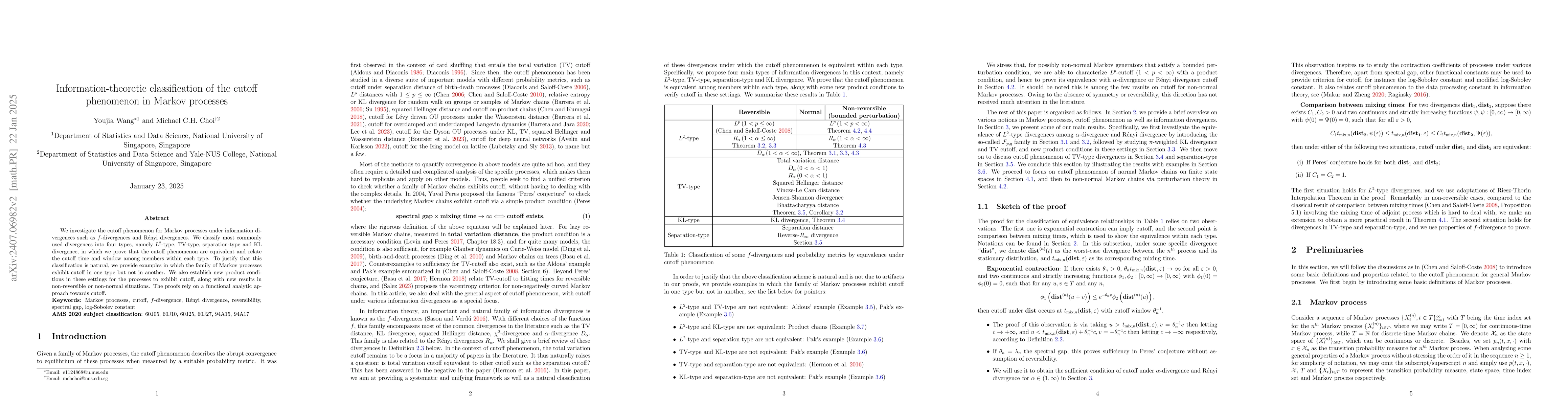 This paper classifies Markov processes' cutoff phenomena into four types based on $f$-divergences and Rényi divergences, proving equivalent cutoff behavior within each type and establishing new product conditions for cutoff in non-reversible processes. The classification is justified through examples showing cutoff in one type but not another.