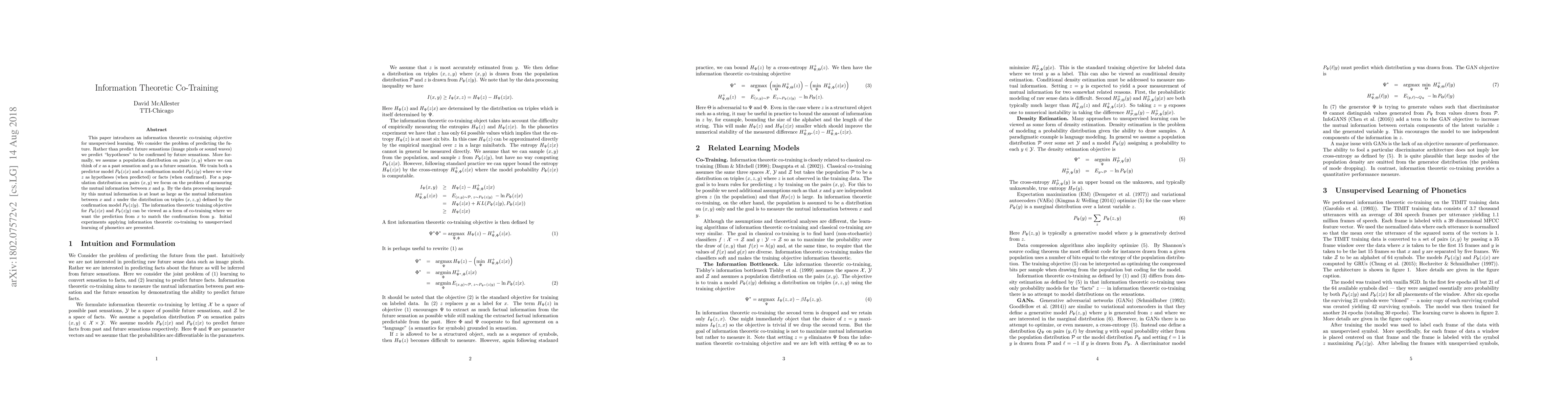 This paper proposes an information theoretic co-training objective for unsupervised learning, focusing on predicting hypotheses that will be confirmed by future sensations. It trains two models to maximize mutual information between past and future sensations, aiming to align predictions with confirmations.
