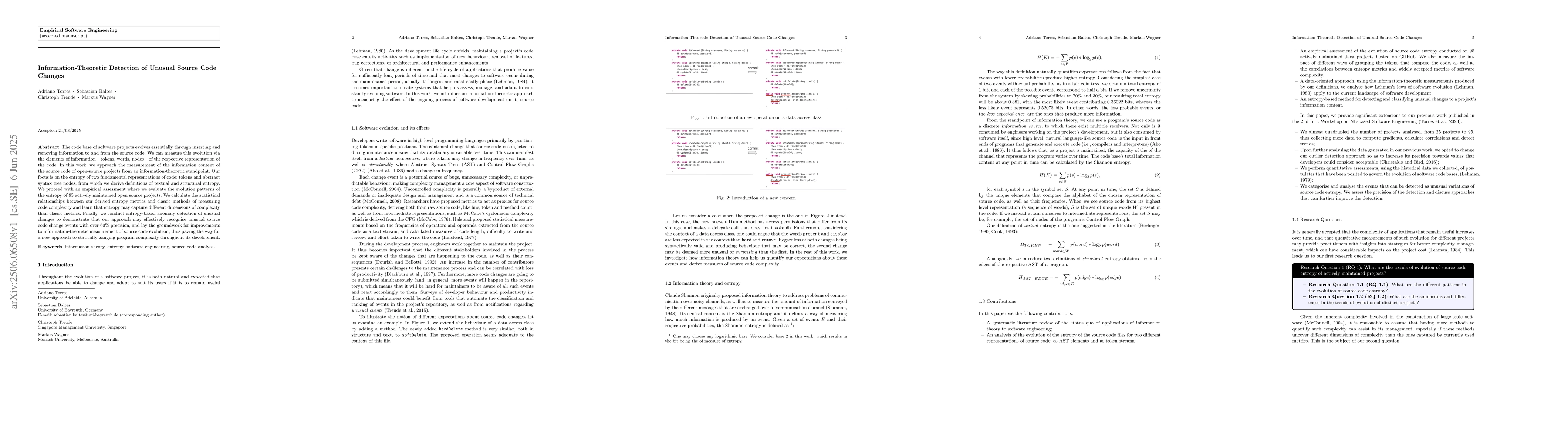 The code base of software projects evolves essentially through inserting and removing information to and from the source code. We can measure this evolution via the elements of information - tokens, words, nodes - of the respective representation of the code. In this work, we approach the measurement of the information content of the source code of open-source projects from an information-theoretic standpoint. Our focus is on the entropy of two fundamental representations of code: tokens and abstract syntax tree nodes, from which we derive definitions of textual and structural entropy. We proceed with an empirical assessment where we evaluate the evolution patterns of the entropy of 95 actively maintained open source projects. We calculate the statistical relationships between our derived entropy metrics and classic methods of measuring code complexity and learn that entropy may capture different dimensions of complexity than classic metrics. Finally, we conduct entropy-based anomaly detection of unusual changes to demonstrate that our approach may effectively recognise unusual source code change events with over 60% precision, and lay the groundwork for improvements to information-theoretic measurement of source code evolution, thus paving the way for a new approach to statically gauging program complexity throughout its development.