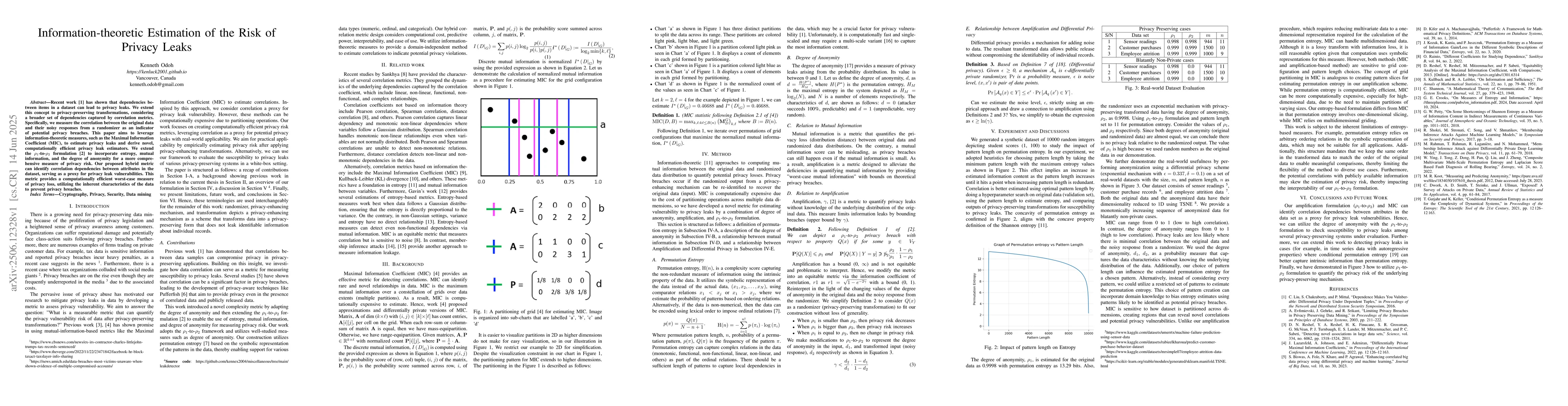 Recent work~\cite{Liu2016} has shown that dependencies between items in a dataset can lead to privacy leaks. We extend this concept to privacy-preserving transformations, considering a broader set of dependencies captured by correlation metrics. Specifically, we measure the correlation between the original data and their noisy responses from a randomizer as an indicator of potential privacy breaches. This paper aims to leverage information-theoretic measures, such as the Maximal Information Coefficient (MIC), to estimate privacy leaks and derive novel, computationally efficient privacy leak estimators. We extend the $\rho_1$-to-$\rho_2$ formulation~\cite{Evfimievski2003} to incorporate entropy, mutual information, and the degree of anonymity for a more comprehensive measure of privacy risk. Our proposed hybrid metric can identify correlation dependencies between attributes in the dataset, serving as a proxy for privacy leak vulnerabilities. This metric provides a computationally efficient worst-case measure of privacy loss, utilizing the inherent characteristics of the data to prevent privacy breaches.