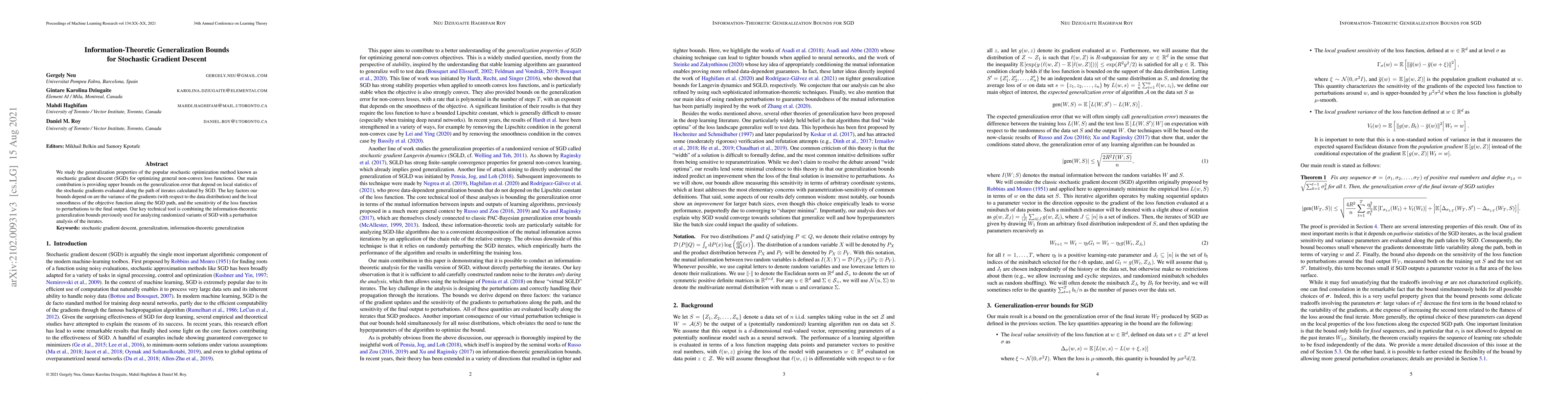We study the generalization properties of the popular stochastic optimization method known as stochastic gradient descent (SGD) for optimizing general non-convex loss functions. Our main contribution is providing upper bounds on the generalization error that depend on local statistics of the stochastic gradients evaluated along the path of iterates calculated by SGD. The key factors our bounds depend on are the variance of the gradients (with respect to the data distribution) and the local smoothness of the objective function along the SGD path, and the sensitivity of the loss function to perturbations to the final output. Our key technical tool is combining the information-theoretic generalization bounds previously used for analyzing randomized variants of SGD with a perturbation analysis of the iterates.