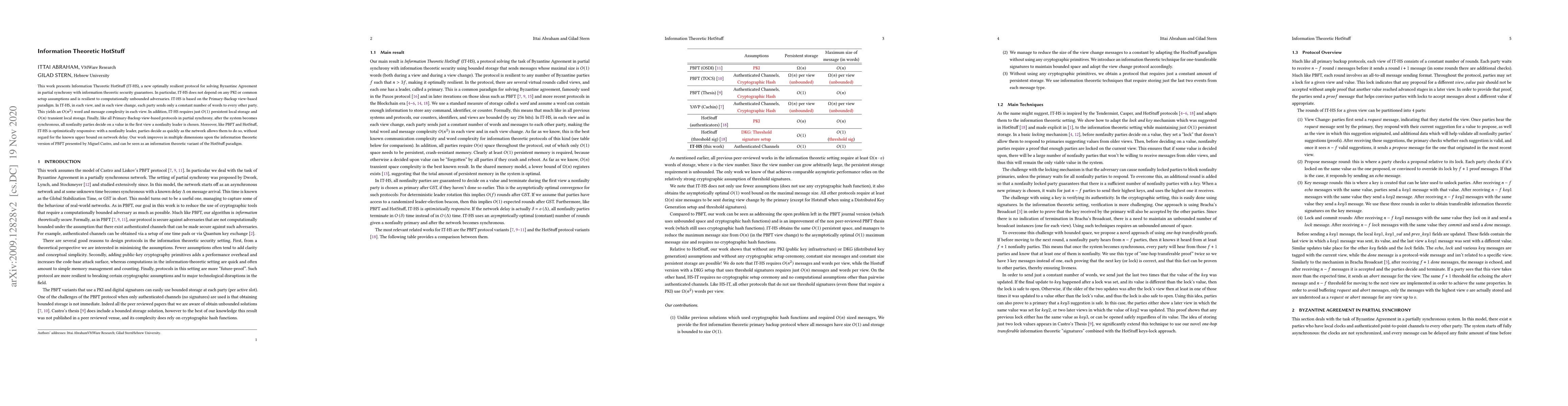 This work presents Information Theoretic HotStuff (IT-HS), a new optimally resilient protocol for solving Byzantine Agreement in partial synchrony with information theoretic security guarantees. In particular, IT-HS does not depend on any PKI or common setup assumptions and is resilient to computationally unbounded adversaries. IT-HS is based on the Primary-Backup view-based paradigm. In IT-HS, in each view, and in each view change, each party sends only a constant number of words to every other party. This yields an $O(n^2)$ word and message complexity in each view. In addition, IT-HS requires just $O(1)$ persistent local storage and $O(n)$ transient local storage. Finally, like all Primary-Backup view-based protocols in partial synchrony, after the system becomes synchronous, all nonfaulty parties decide on a value in the first view a nonfaulty leader is chosen. Moreover, like PBFT and HotStuff, IT-HS is optimistically responsive: with a nonfaulty leader, parties decide as quickly as the network allows them to do so, without regard for the known upper bound on network delay. Our work improves in multiple dimensions upon the information theoretic version of PBFT presented by Miguel Castro, and can be seen as an information theoretic variant of the HotStuff paradigm.